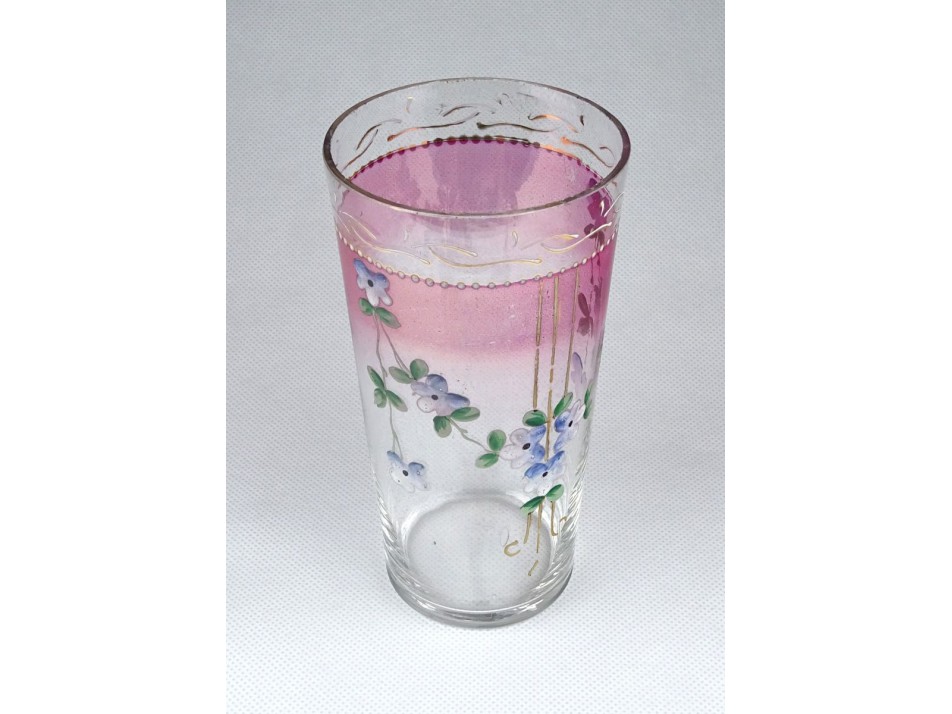 Hibátlan állapotú, rózsaszínre festett, fújt üveg pohár a XIX-XX. század fordulójáról. Oldalán, kézzel festett virág díszítés.