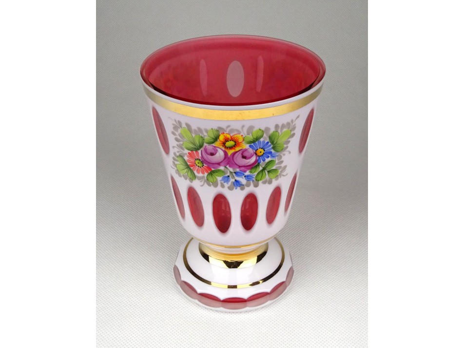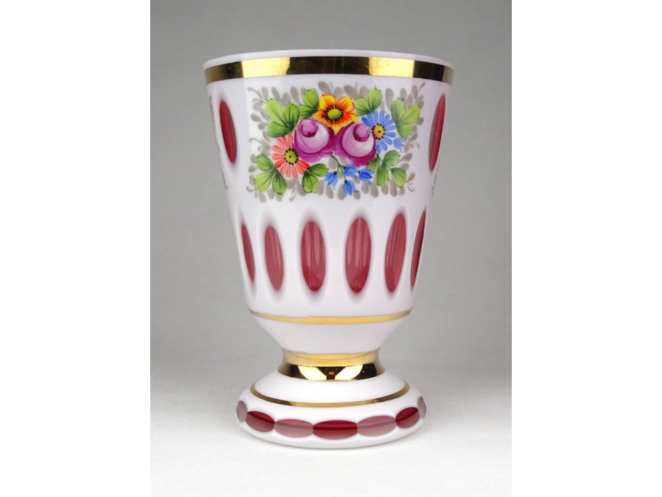 Régi, fehér és rózsaszín rétegelt, aranyozott, talpas cseh bieder üveg pohár. Oldalán kézifestésű virág díszítések csiszolt felületek láthatóak.
