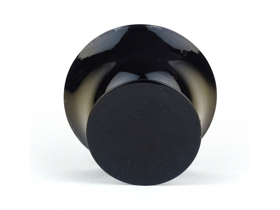 Antik, hibátlan állapotú, fekete színű, talpas üveg kehely, fagylaltos kehely. A kehely peremén kívülről kopottas ezüst szegély nyomai és oldalán halvány hal motívum látható.