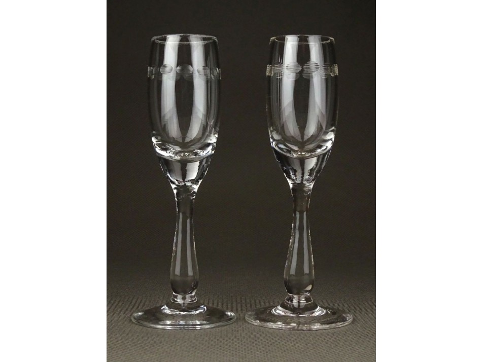 Két darab antik egyforma, hibátlan állapotú csiszolt üveg pohár, talpas röviditalos pálinkás pohár. Oldalán finom apró csiszolt díszítés látható. 1920-as évek.
