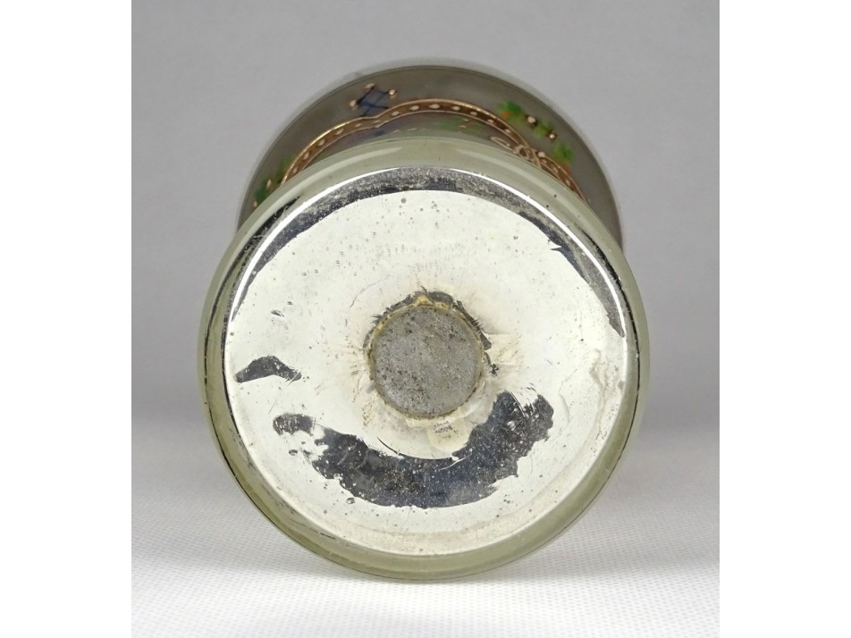 Antik, hibátlan állapotú, gyönyörű foncsorozott fújt üveg Biedermeier pohár, XIX. századból. Oldalán gyönyörű kézzel festett, aranyozott díszítés látható. A pohár teste üreges.