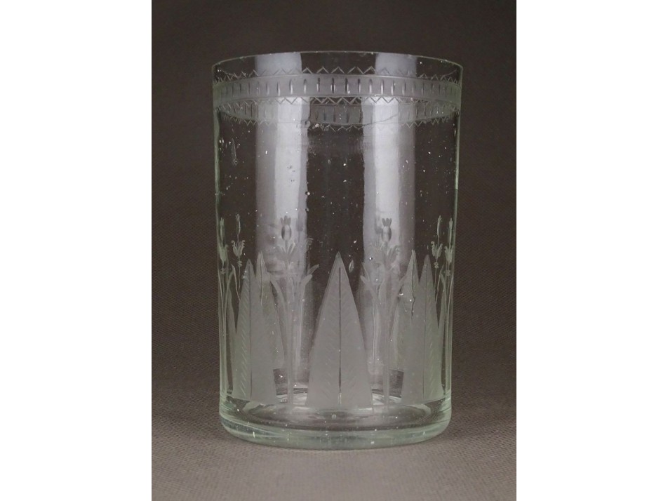 Antik, szép állapotú, fújt üveg pohár. A pohár felületén a levegő zárványok, buborékok több helyen láthatók. A pohár falán finom, részletgazdag csiszolt díszítés látható.
