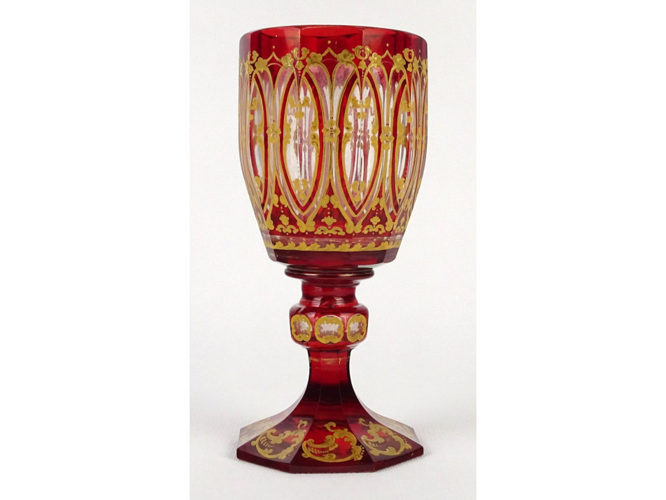 Gyönyörű, hibátlan állapotú, antik 1850 körüli Biedermeier talpas üveg pohár, üveg kupa. Kétrétegű, bíborpácolt és kézzel festett, gazdagon díszített, aranyozott talpas fújt üveg pohár. Teste tíz lapra csiszolt.