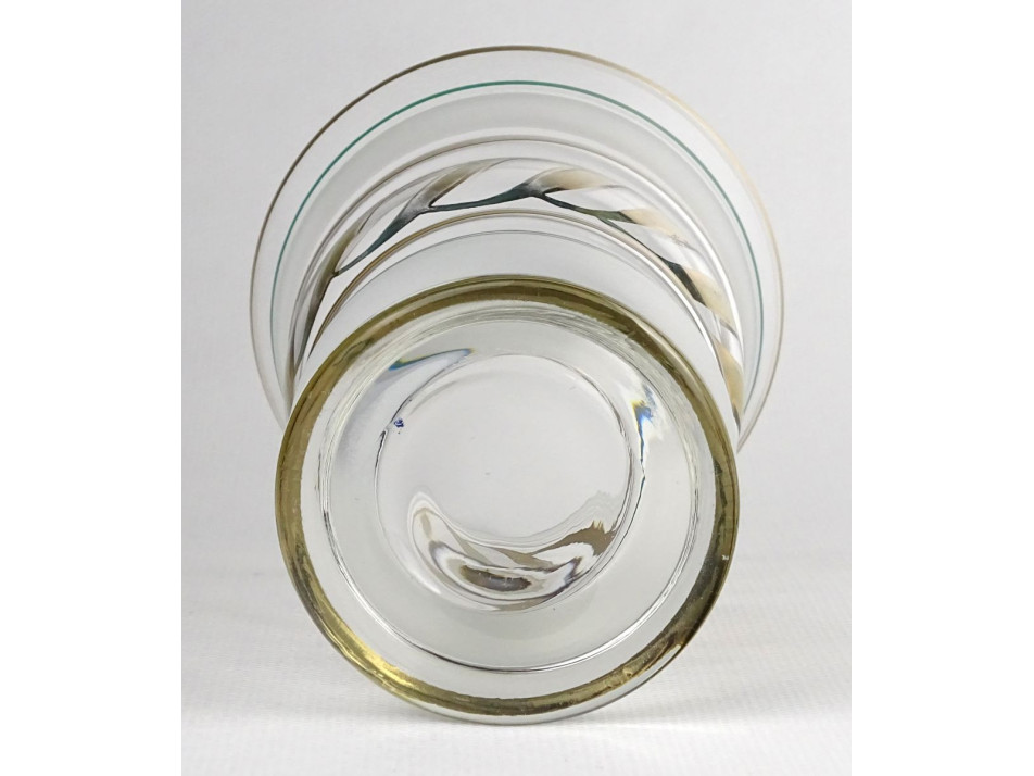 Hibátlan állapotú, fújt üveg pohár. Vékony falú, talpas, lépcsőzetes kialakítású. Aranyozással és kézi festéssel díszített.