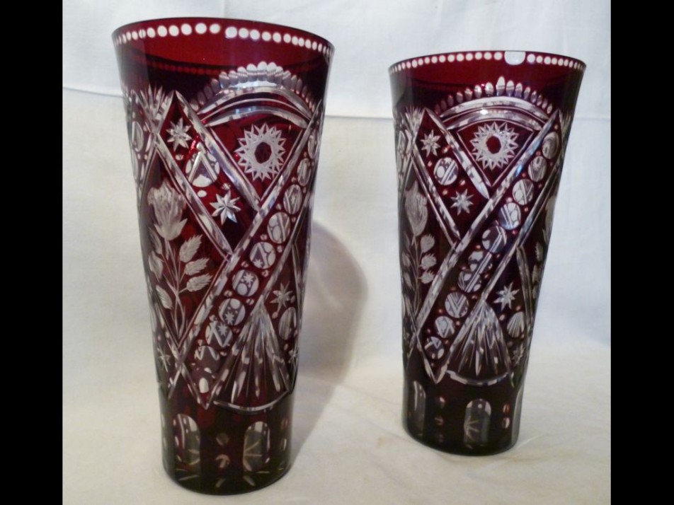 Nagy méretű, hibátlan állapotú nagyon gazdagon csiszolt bordóra színezett váza pár. Oldalán gyönyörű rózsa díszítésekkel.