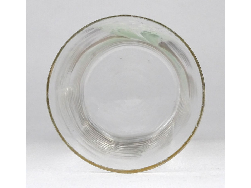 Antik festett, fújt üveg pohár a XIX-XX. század fordulójáról. Oldalán, kézzel festett, aranyozott virág, gyöngyvirág díszítés. A poháron egy cca 2-3 cm-es hajszálrepedés található, lásd fotó.