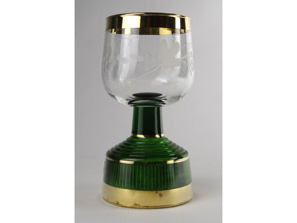 Régi hibátlan állapotú, aranyozott, zöld talpas üveg pohár kehely. Oldalán csiszolt szőlőfürt díszítéssel. A talpában zenélő szerkezet található.