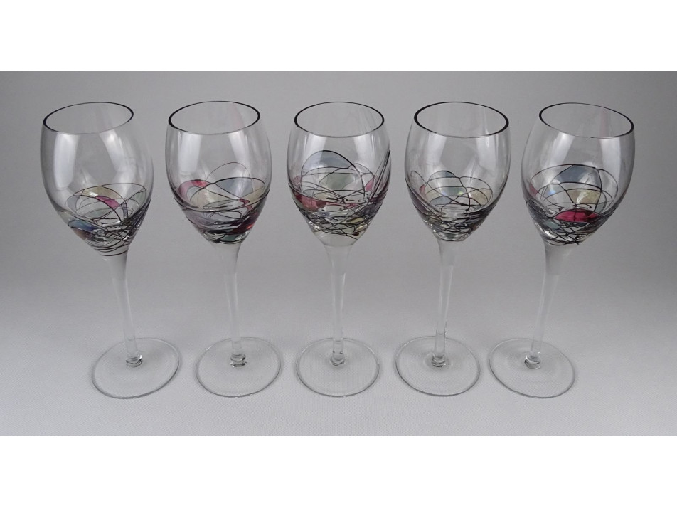 Hibátlan állapotú, nagy méretű talpas pezsgős pohár készlet, elegáns forma. Öt darabos gyönyörű készlet, oldalán kézzel festett, csorgatott, Miro festményeire hajazó modern festett díszítéssel.
