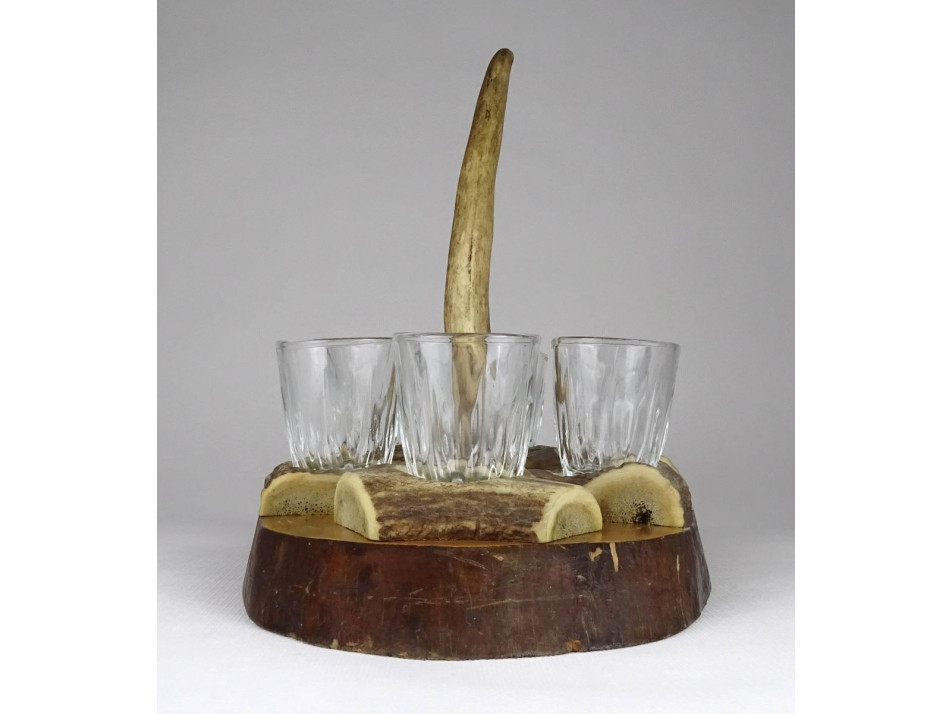 Szép állapotú ovális alakú fa tartón agancs foglalatban található hibátlan állapotú üveg pálinkás pohár készlet.