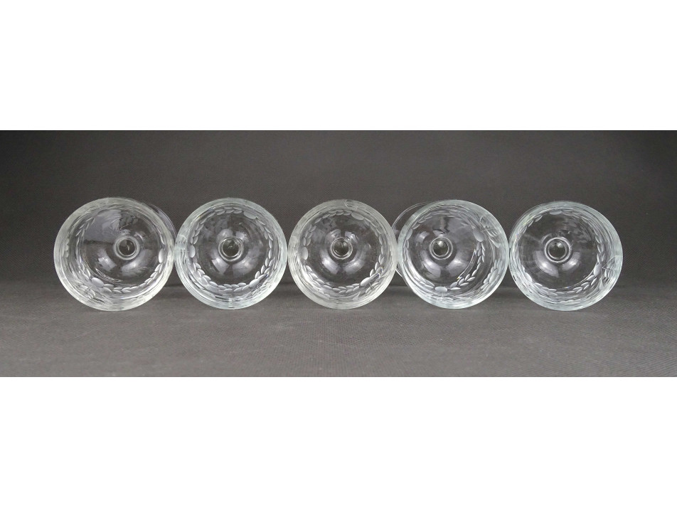 Hibátlan állapotú, talpas csiszoltüveg fehérboros pohár készlet. Oldalán finom csiszolt díszítés látható.