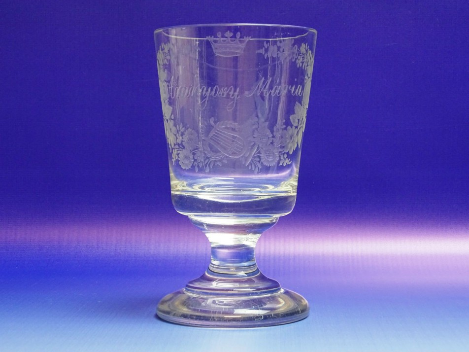 Rendkívül ritka, név beírt, koronával és lanttal díszített biedermeier talpas pohár.
