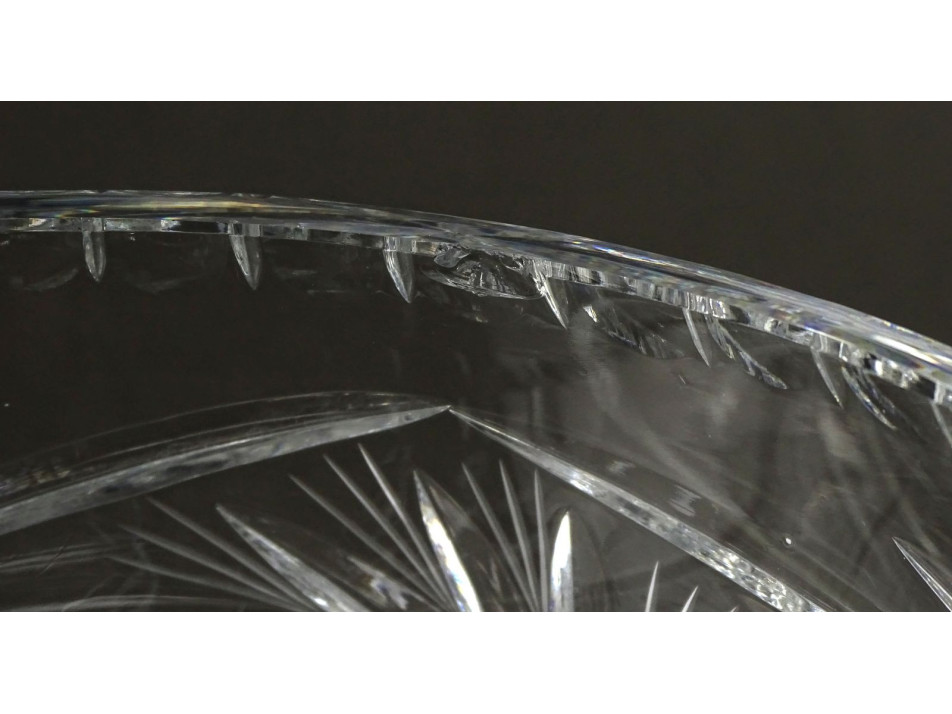 Hibátlan állapotú, csiszolatokkal gazdagon díszített, vastag falú, gyönyörű, hatalmas asztalközép kínáló tál, kristály tál.