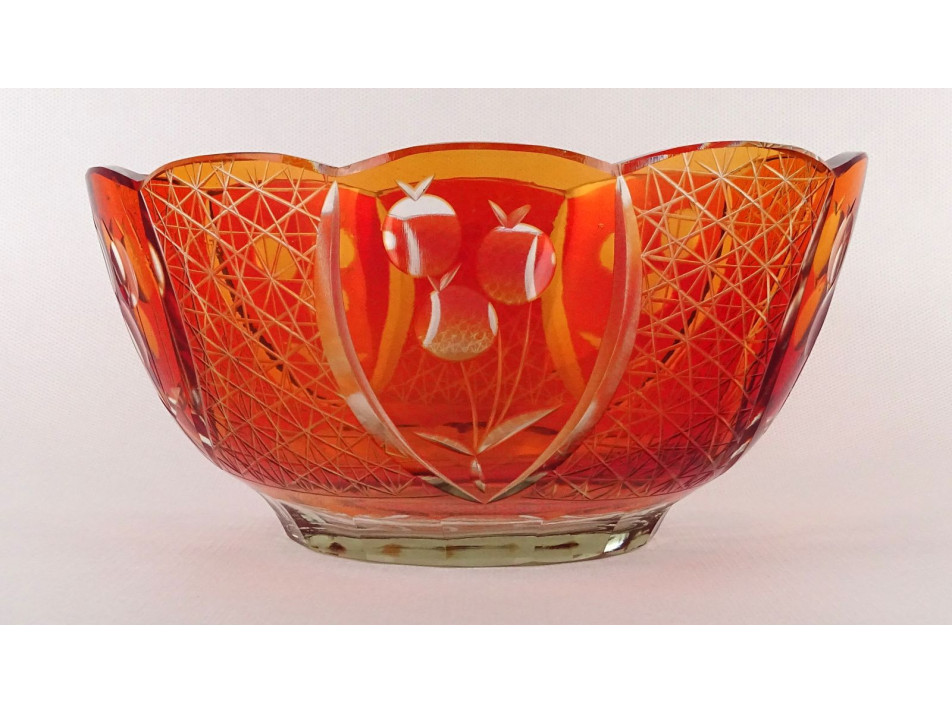 Szép állapotú, csiszolatokkal gazdagon díszített, narancsra színezett öblös kristály tál, asztalközép kínáló tál, gyümölcskínáló üveg tál.
