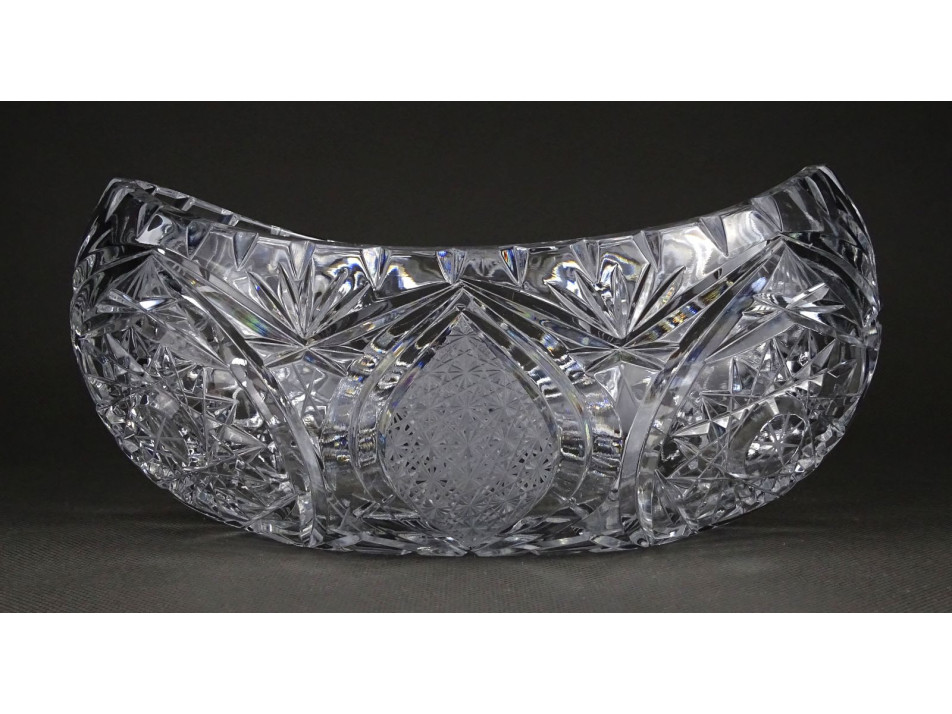 Csiszolatokkal gazdagon díszített, nagy méretű, vastagfalú gyönyörű ovális alakú kristály gyümölcstál, kínáló tál, gyümölcskínáló tál.