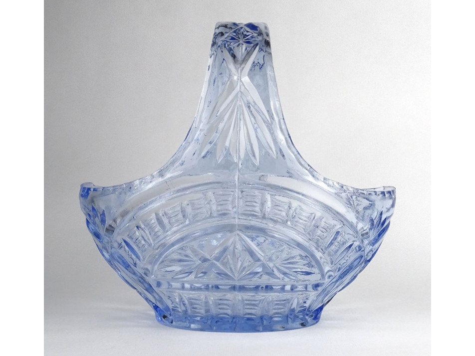 Régi extra nagy méretű vastagfalú hibátlan állapotú kék üveg kosár. Formába préselt üveg kosár. Asztalközép kínáló tál.