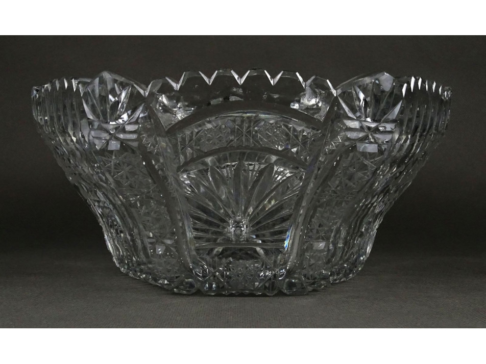 Gyönyörű, csiszolatokkal gazdagon díszített, nagy méretű öblös kristály tál, kínáló tál. Gyümölcskínáló tál, asztalközép kínáló tál.