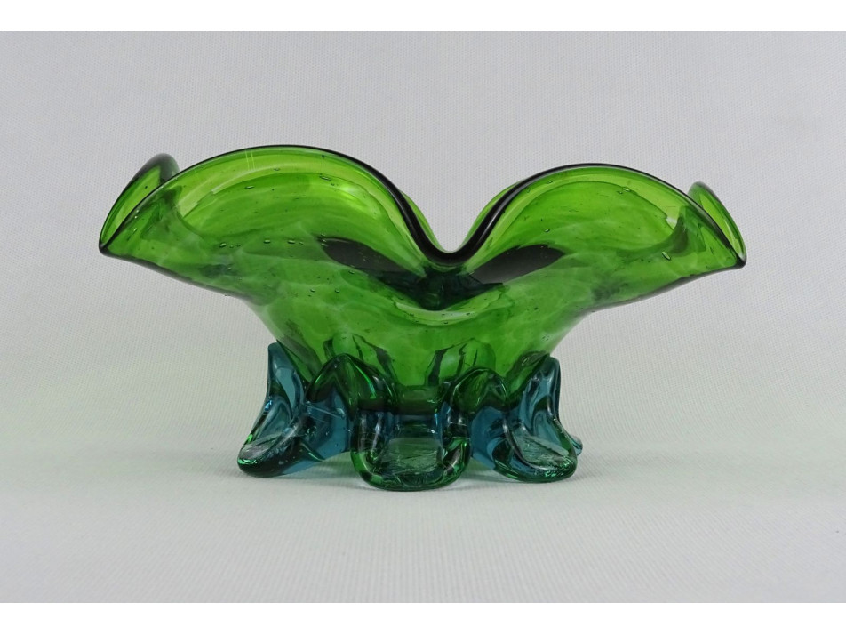 Hibátlan állapotú, zöld - türkiz fújtüveg tál, asztalközép. A tál teste levegőzárványokkal teli, alján a fújás és szakítás nyoma látható.