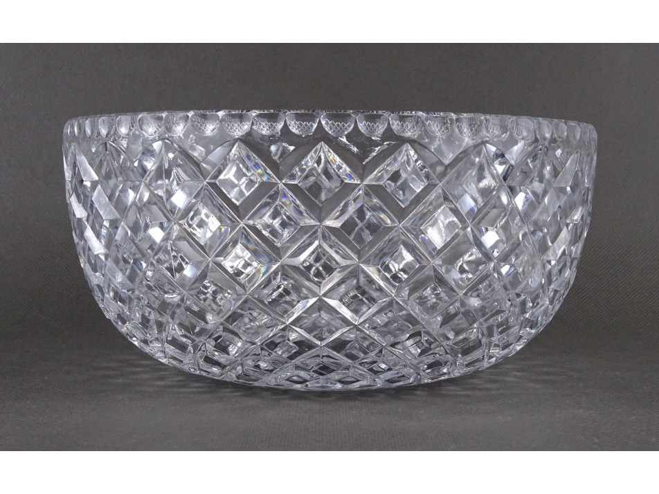 Hibátlan állapotú, csiszolatokkal gazdagon díszített, vastag falú, gyönyörű kristály kínáló tál, asztalközép kínáló gyümölcstál.