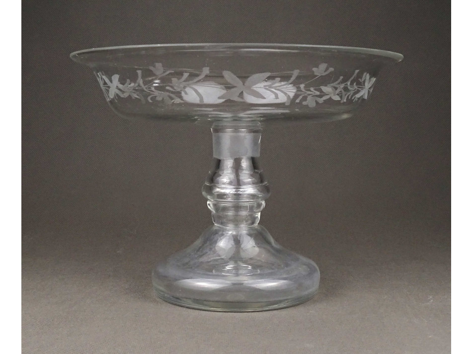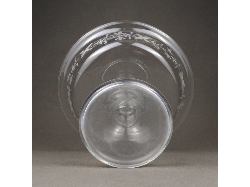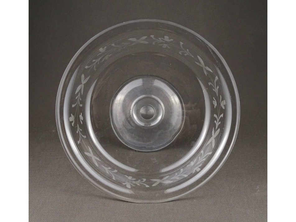 Antik, hibátlan állapotú, csiszolt virágokkal díszített talpas üveg asztalközép kínáló tál, gyümölcstál. A tál talpa üreges.