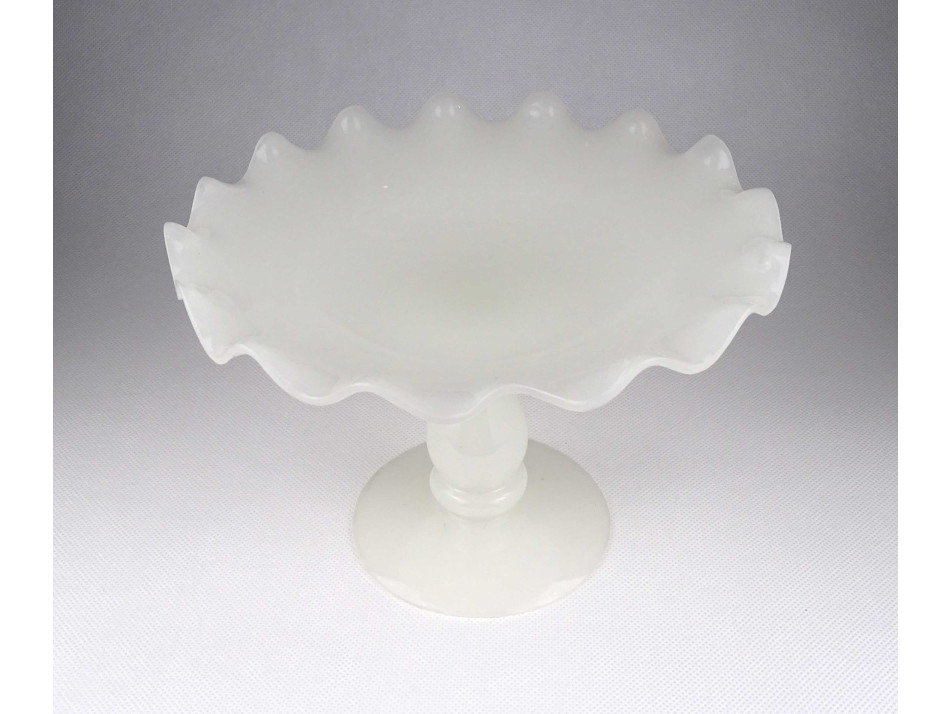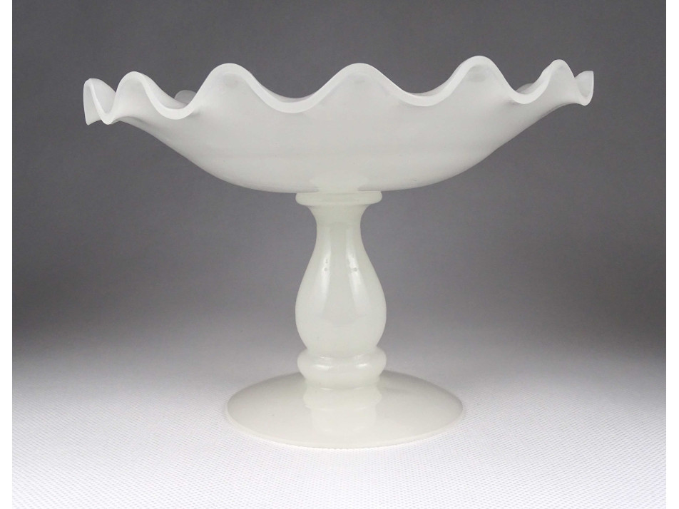 Antik, hibátlan állapotú, fehér kalcedon üveg, fújtüveg művészi talpas asztalközép kínáló tál, gyümölcskínáló tál.