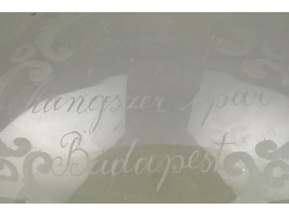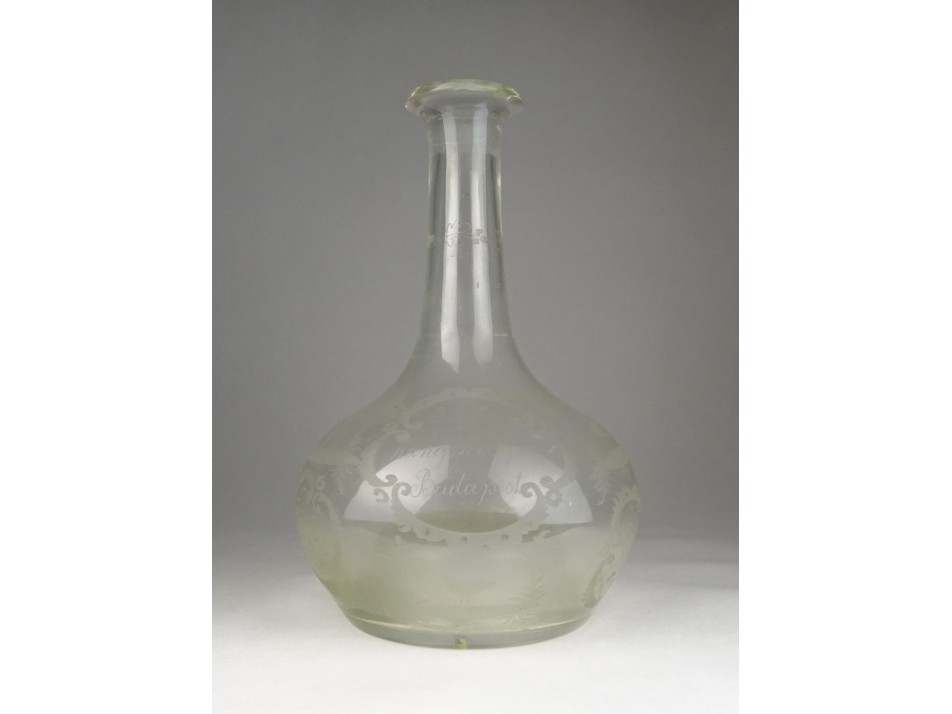 Antik, szép állapotú, csiszolatokkal gazdagon díszített, nagyméretű ital kínáló üveg. Talpa mélyen homorú, az üveg felületén őz és madár díszítés mellett felirat olvasható: