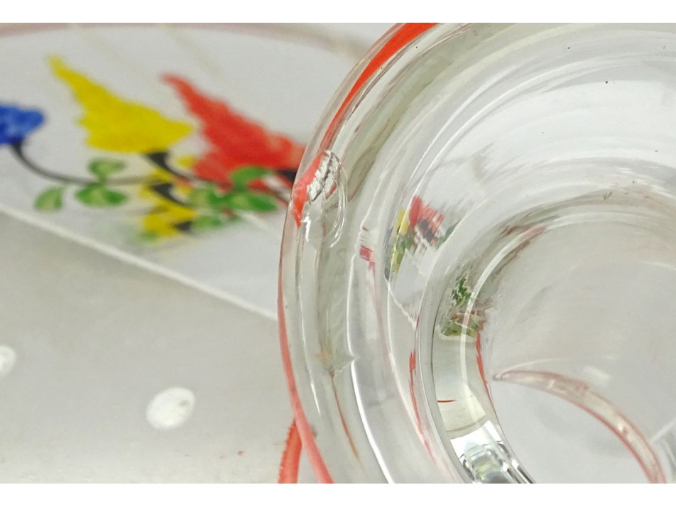 Régi, hibátlan állapotú, dugós likőrös üveg kínáló, italkínáló. Felületén festett motívumok, szőlőfürt díszítés. Érdekes, oldalára billentett, füllel és lábakkal rendelkező forma. Célja, hogy amíg ki nem ürül le nem tehető!