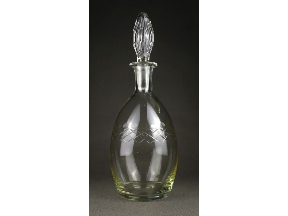 Nagyon szép, régi, 1920-as évekből való, csiszolatokkal díszített, nagy méretű dugóval rendelkező fújt üveg asztali italkínáló, dugós üveg. Az üveg talpán szépen látható a fújás, szakítás nyomának kicsiszolása.