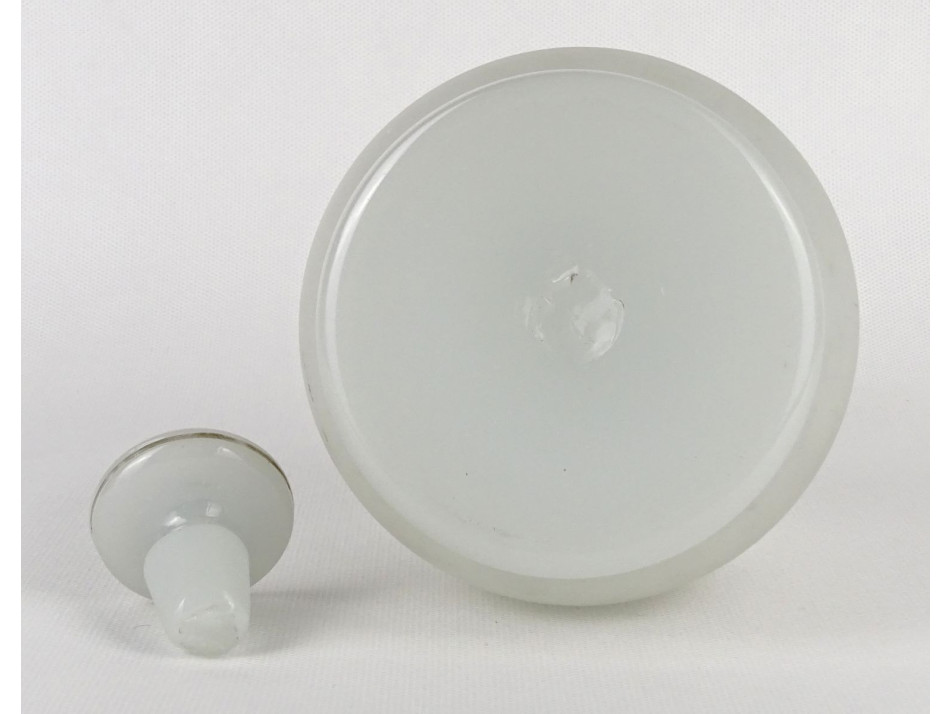 Antik, 1800 vége körüli szép állapotú, maratott homok színű, színezett talpas fúvott üveg palack, dugós üveg, ital kínáló. Oldalát kézifestés díszíti. Eredeti fúvott üveg dugója is meg van. Talpán a fúvás, szakítás nyoma szépen látszik.