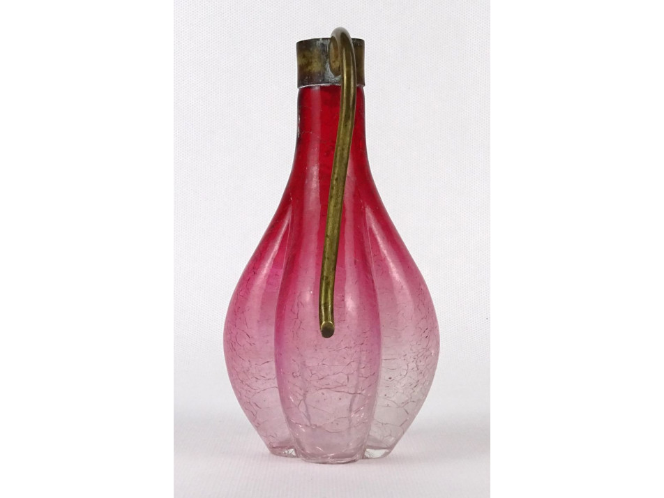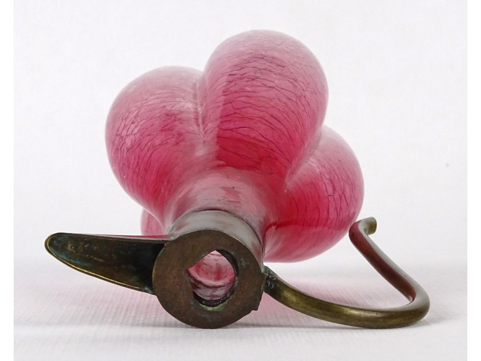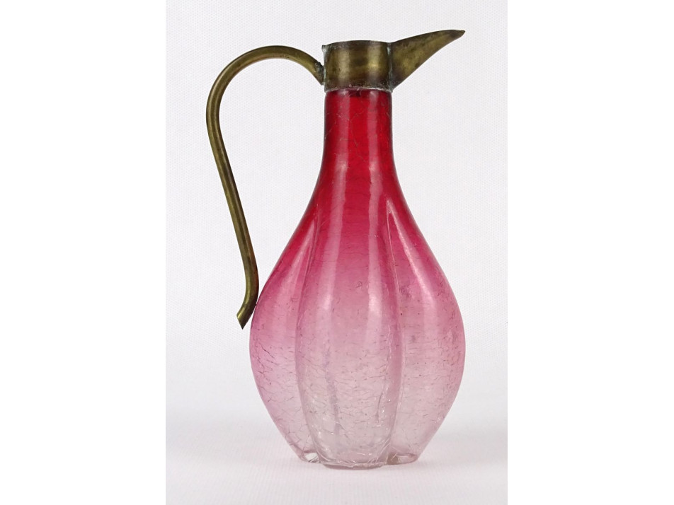 Antik, szép állapotú, gerezdes testű gyönyörű rózsaszín repesztett üveg kiöntő, karaffa az 1800-as évek végéről. Réz fül és kiöntőcsúcs található rajta. Olajos vagy ecetes üveg lehetett.