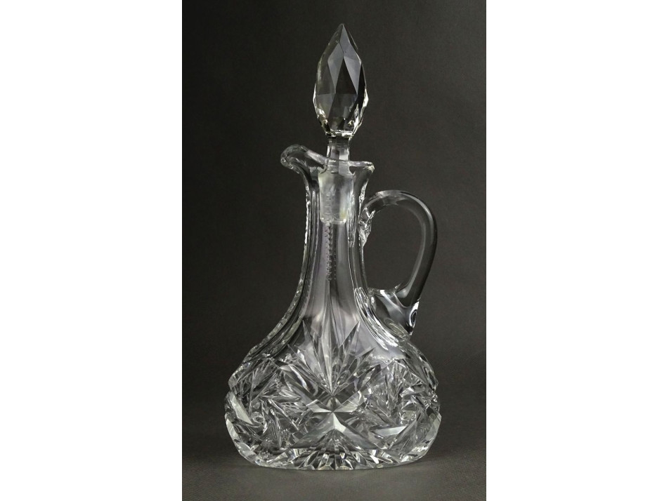 Hibátlan állapotú ecetes vagy olajos üveg kiöntő csiszolt üveg dugóval. A testet gyönyörű kézi csiszolás díszíti.