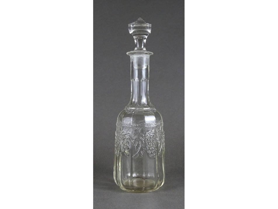 Szép állapotú antik üveg palack, dugóval. Az üveg oldala körben plasztikus szőlőlevél és szőlőfürt motívumokkal díszített.