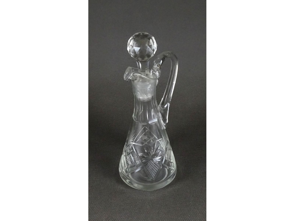 Régi, hibátlan állapotú, körben csiszolatokkal díszített, ecet vagy olaj asztali üveg kiöntő, kínáló dugóval.