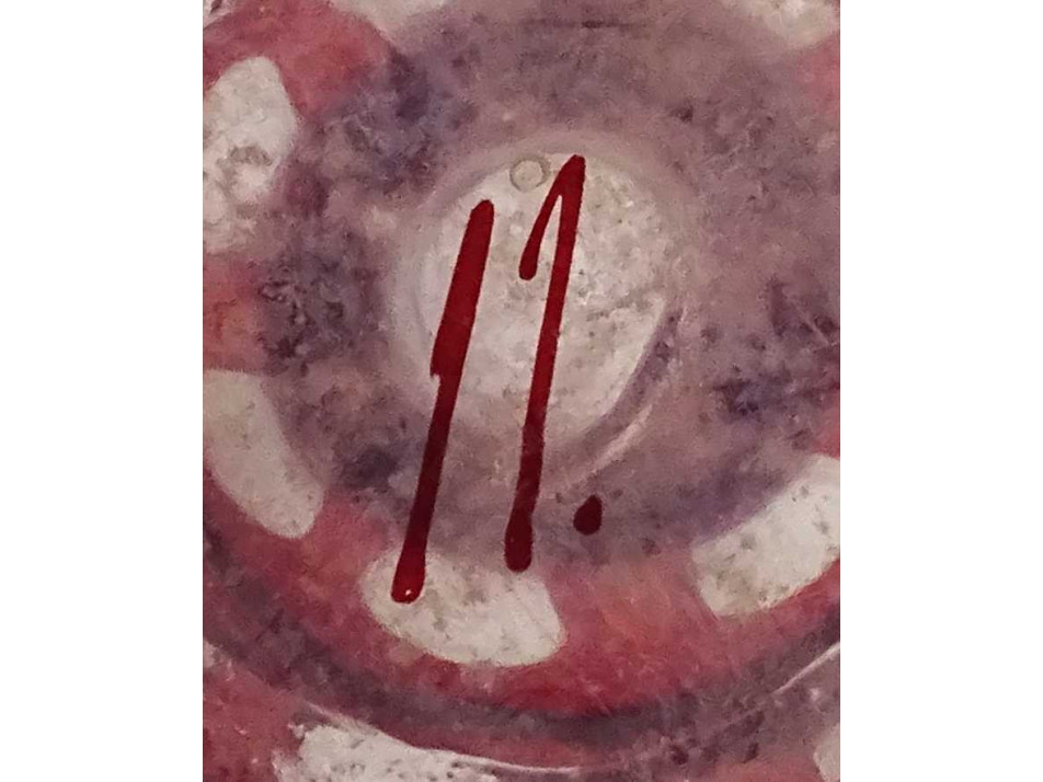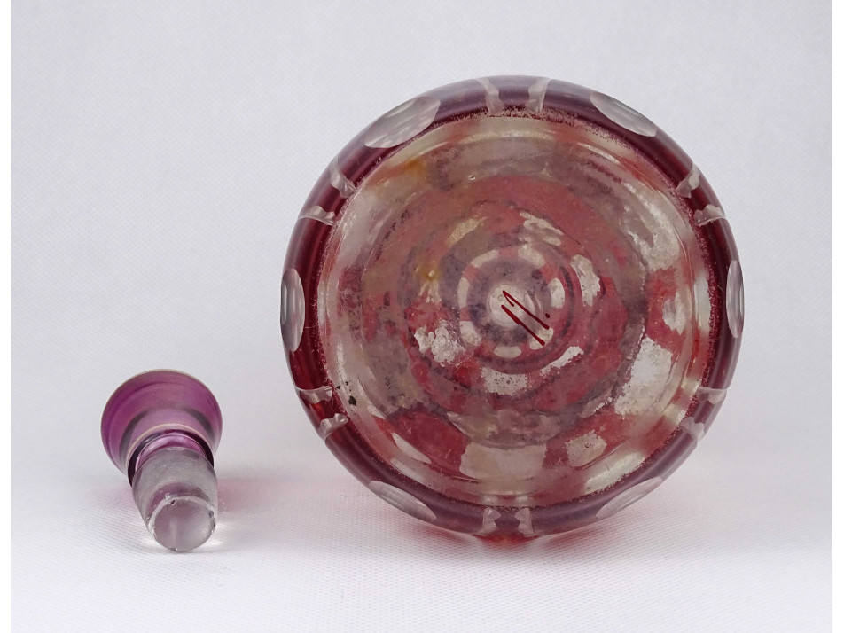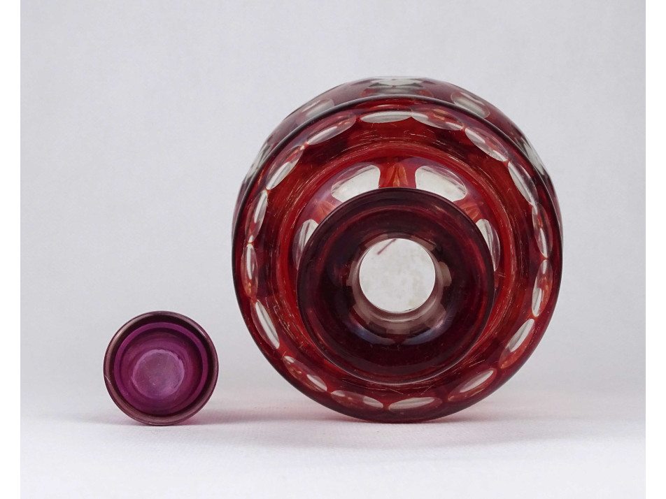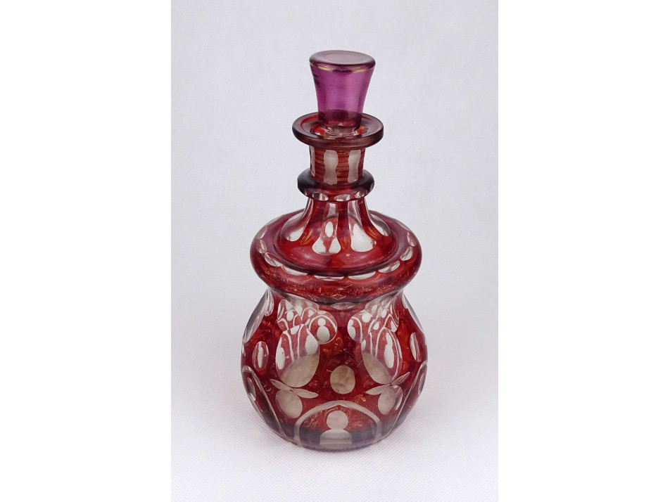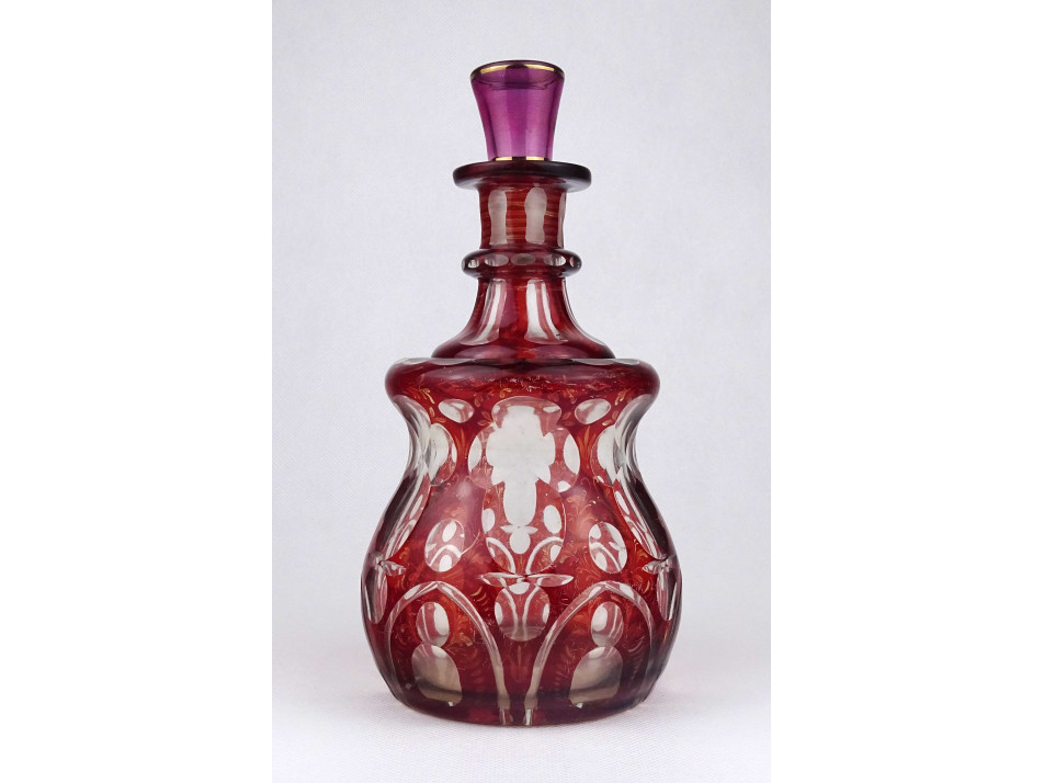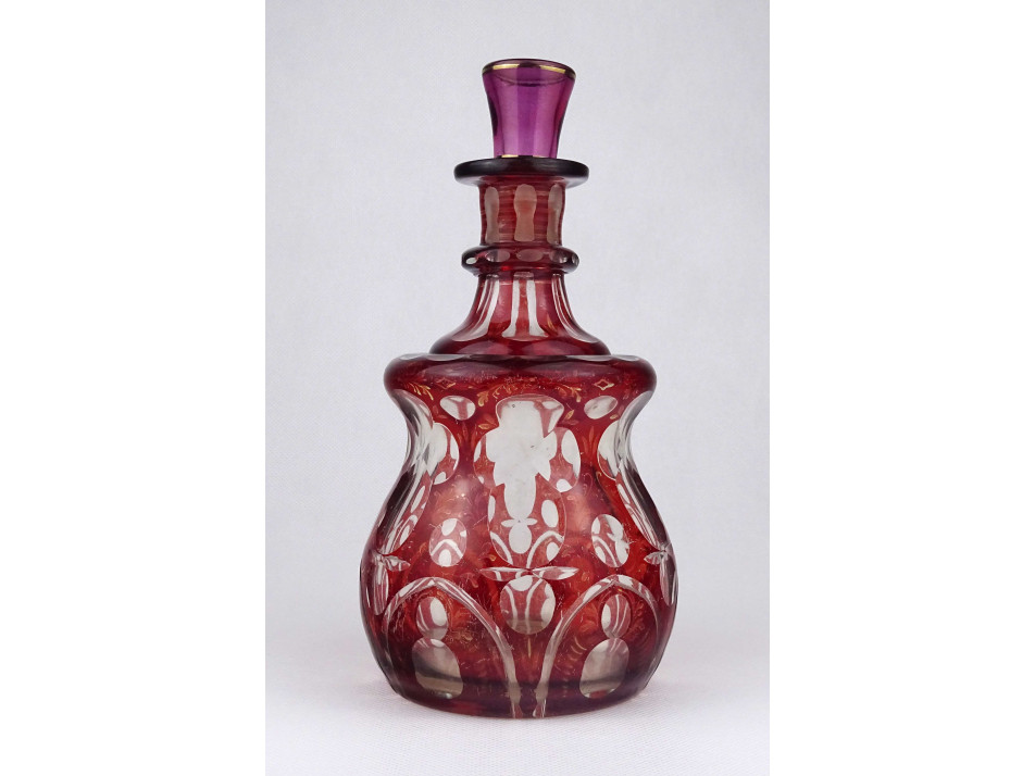 Antik, biedermeier bíborpácolt, csiszolt dugós üveg. Felülete a csiszolatok közötti bíbor részeken apró finom növényi motívumokkal díszített.