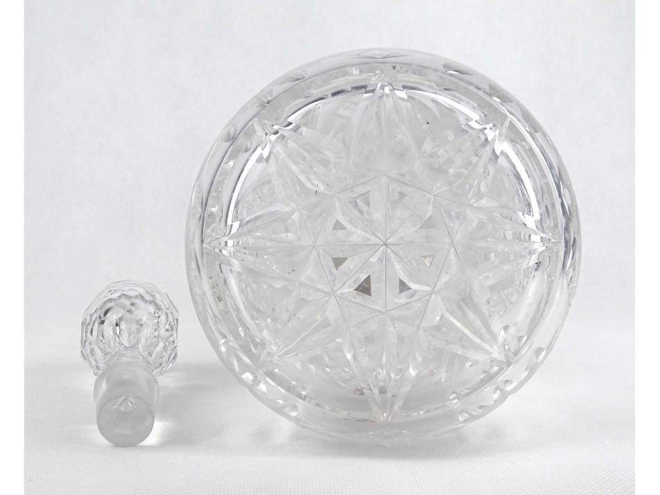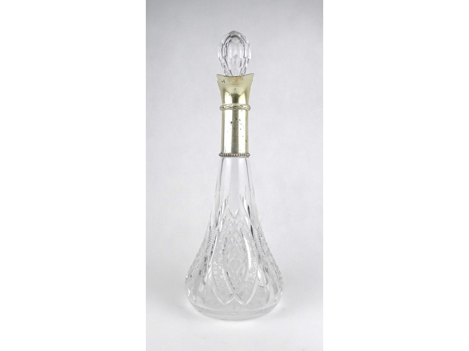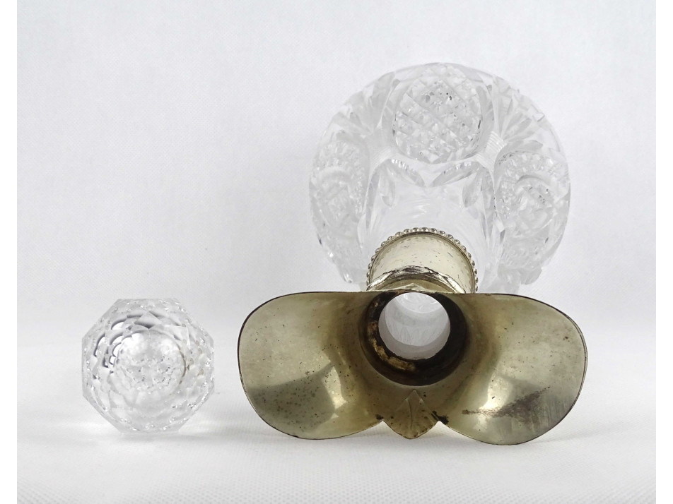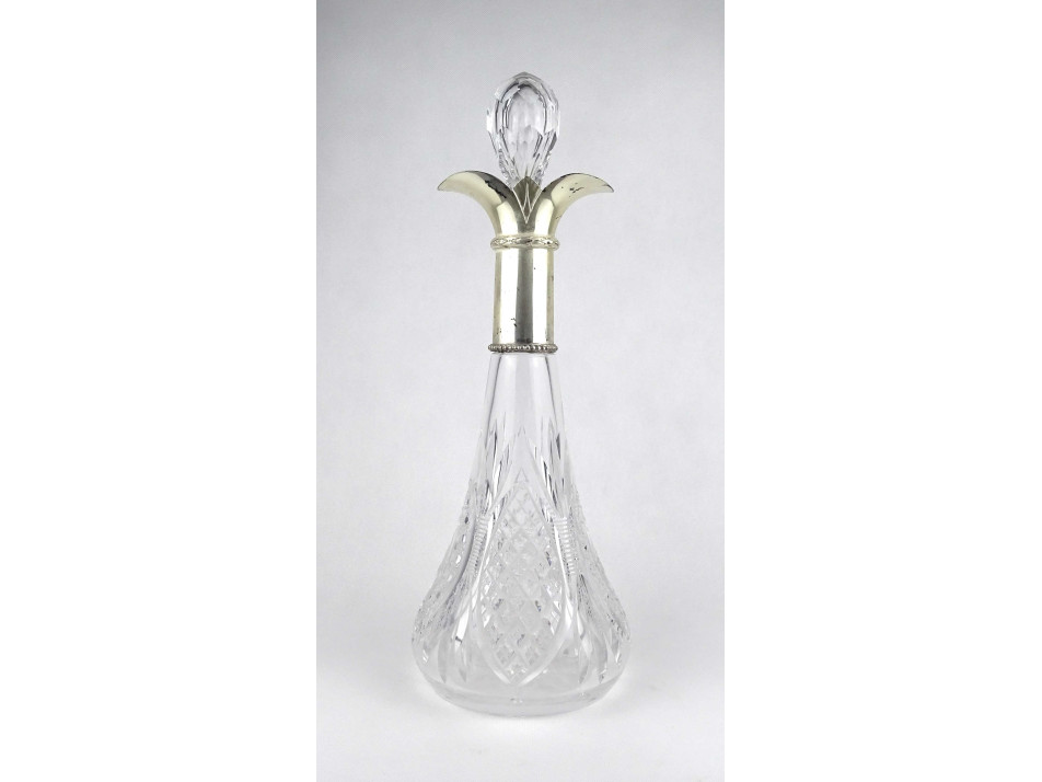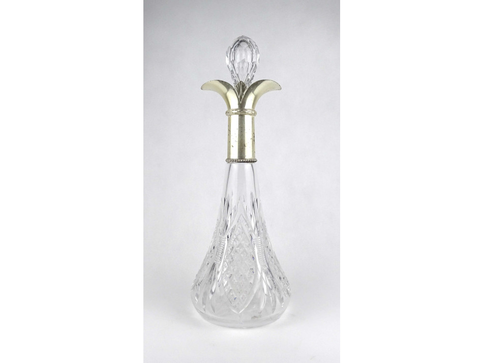 Antik, hibátlan állapotú, vastagon ezüstözött, fém nyakú, csiszolatokkal gazdagon díszített, kristály italkínáló palack, kínáló üveg, eredeti csiszolt dugójával.