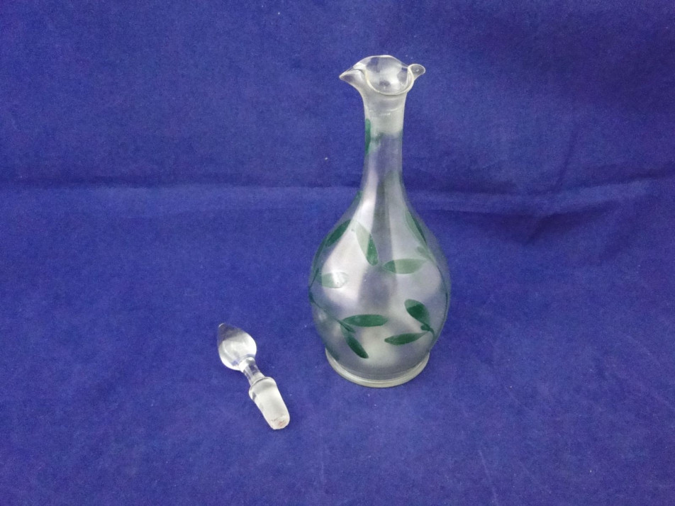 Gyönyörű hibátlan állapotú fújt, szakított üveg, oldalán zöld virág, levél díszítéssel. Szájánál szép fodros díszítésű.