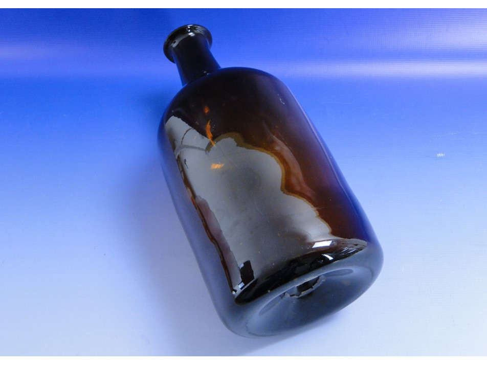 Hibátlan állapotú, sötétbarna színű, 1800-as évek végéről való, fújt üveg, szakított üveg, gyógyszeres üvegpalack.