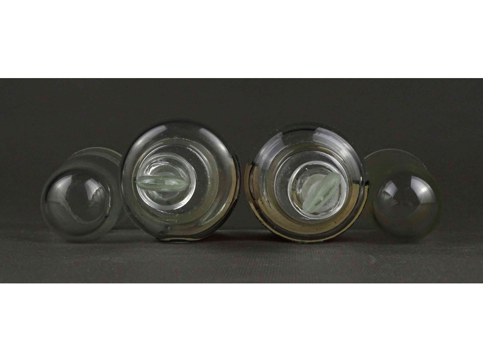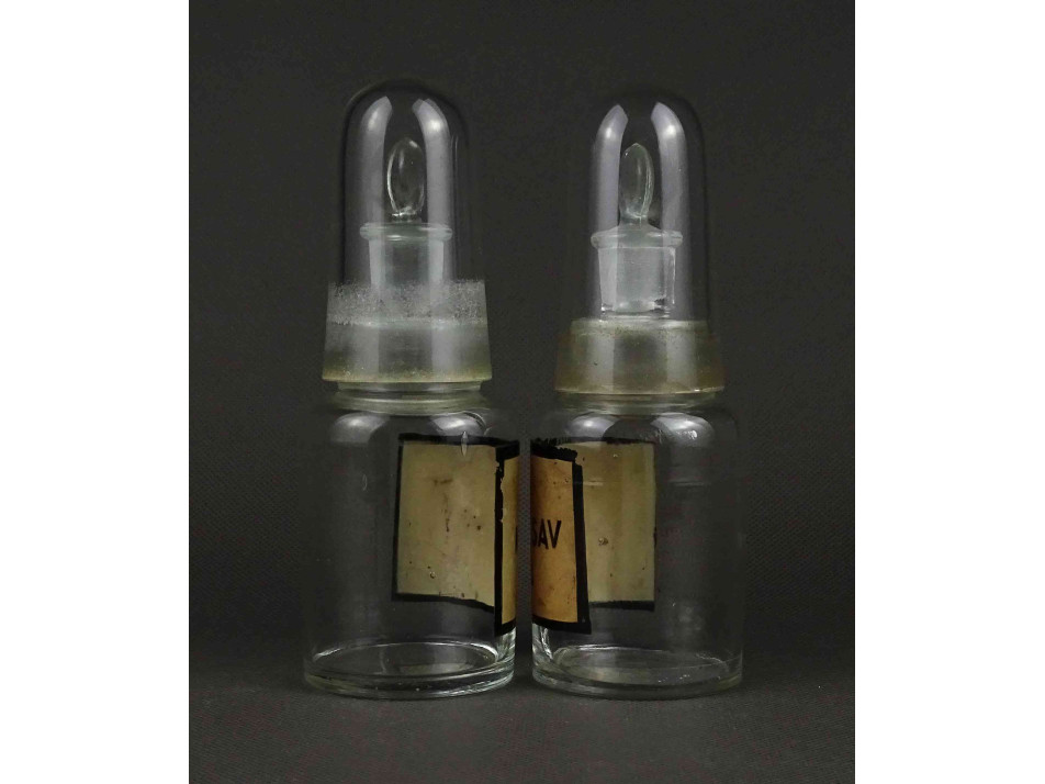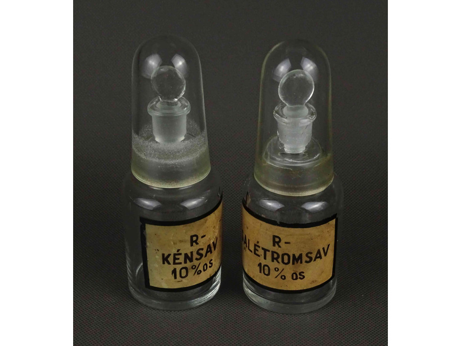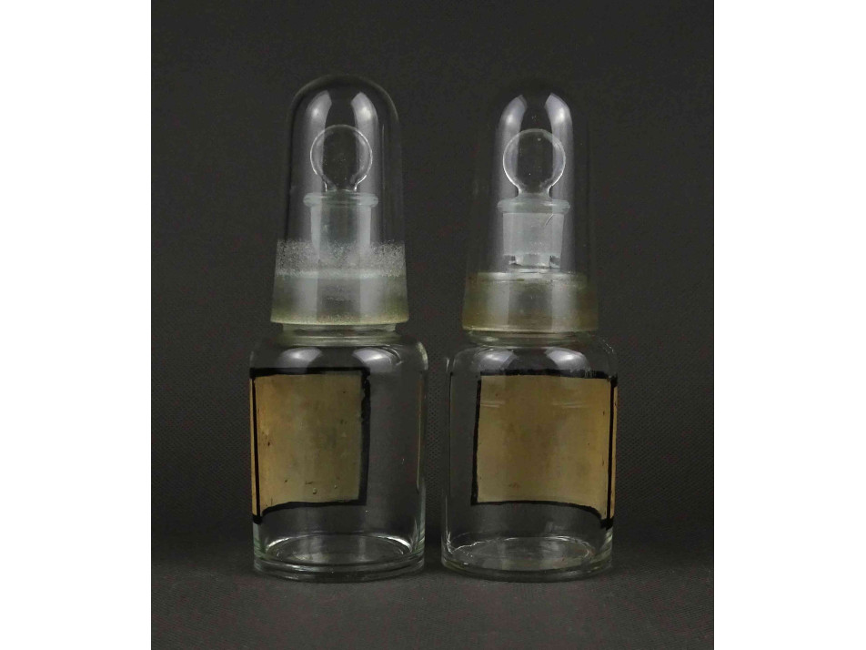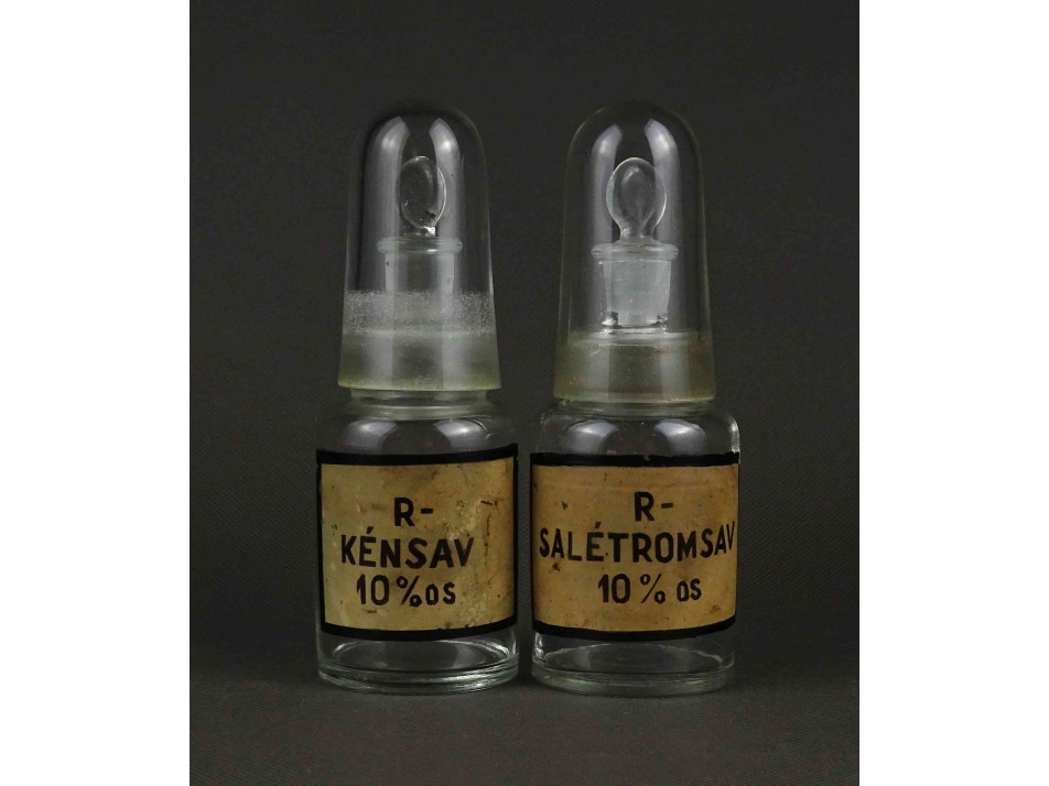 Régi, hibátlan állapotú, különleges, duplán zárt, csiszolt dugós laboratóriumi üveg, gyógyszertári üveg, patikaüveg, gyógyszeres edény pár.