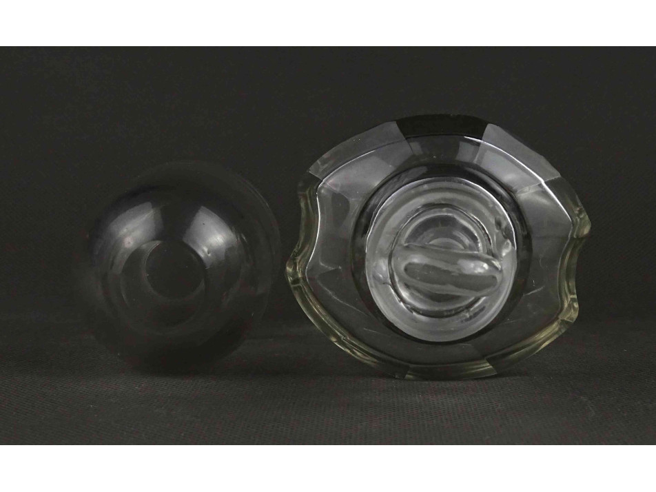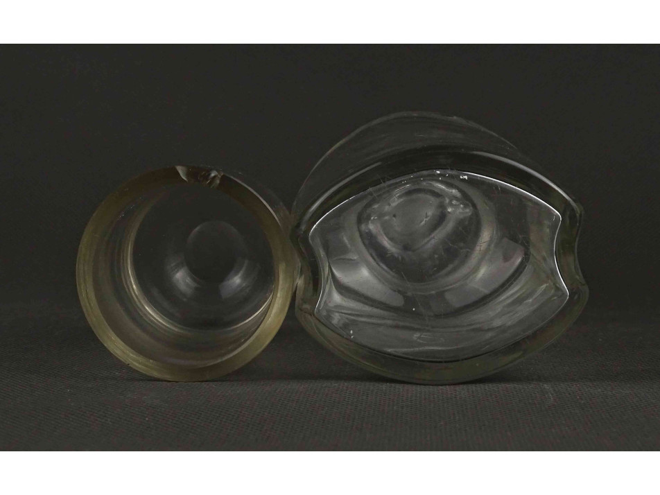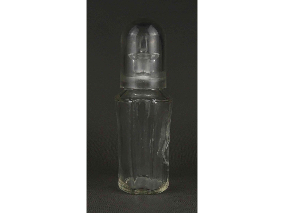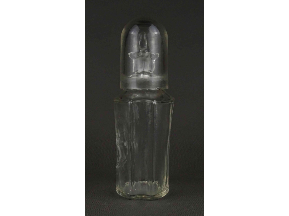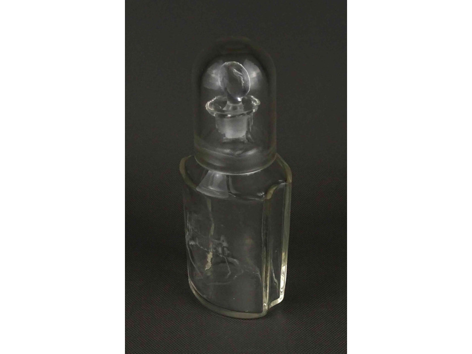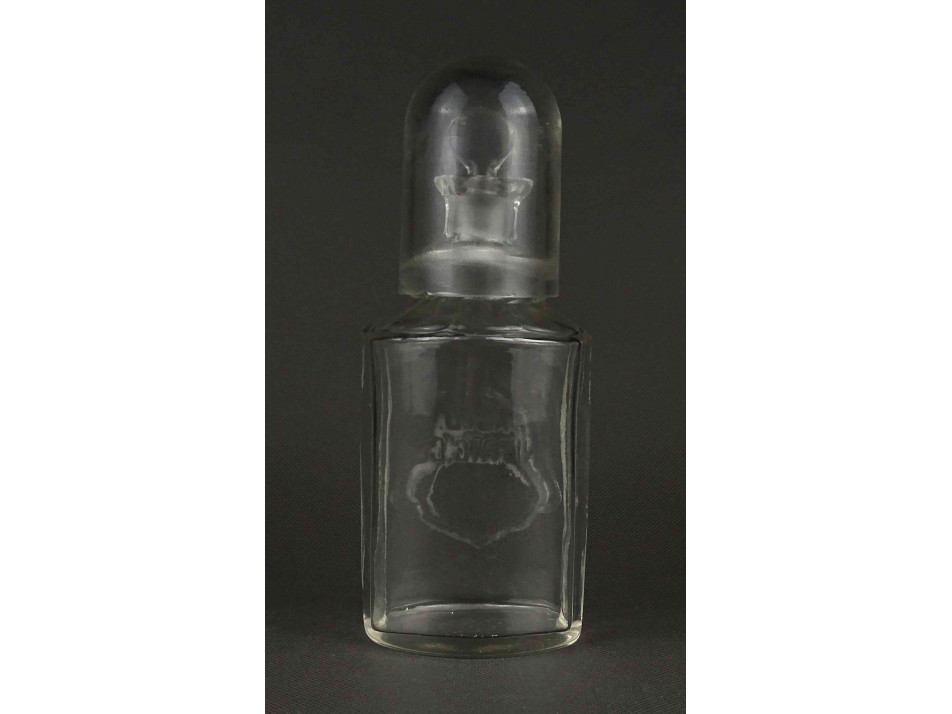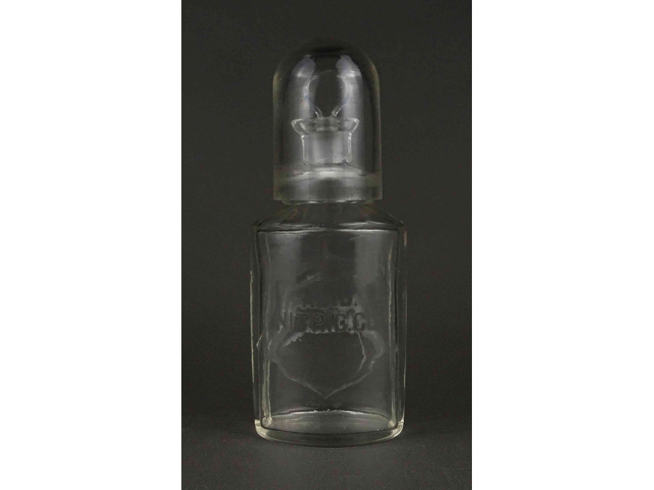 Régi, szép állapotú, különleges duplán zárt csiszolt dugós laboratóriumi üveg, gyógyszertári üveg, patikaüveg, gyógyszeres edény. Felirata kopott, de olvasható. Az üveg száján néhány apró lepattanás látható.