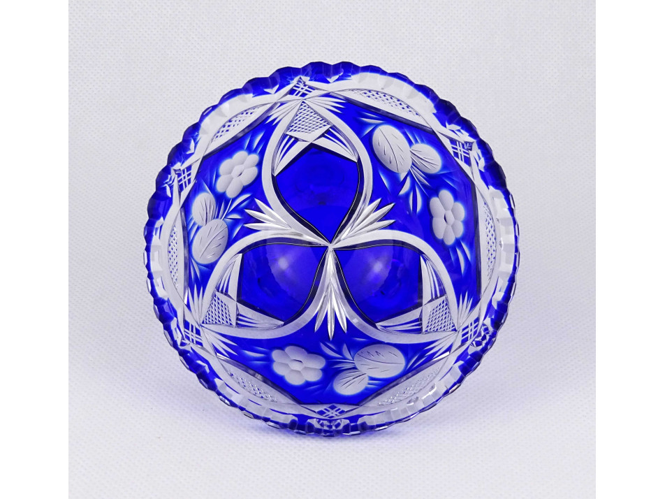 Hibátlan állapotú, kisméretű, csiszolatokkal gazdagon díszített, három csigalábon álló, kékre színezett kristály tál, tálka.