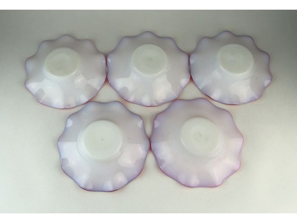 Antik, fodros szélű, fújt, szakított üveg desszertes, öt darabos tányér készlet. Aljukon látható a kicsiszolt szakítás nyoma. Színe rózsaszín, kézzel festett virágdíszítéssel.