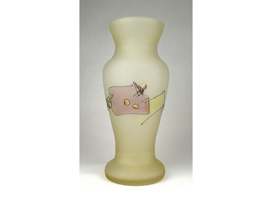 Hibátlan állapotú, fújt, festett üveg váza, díszváza. Oldala plasztikus absztrakt festéssel díszített.