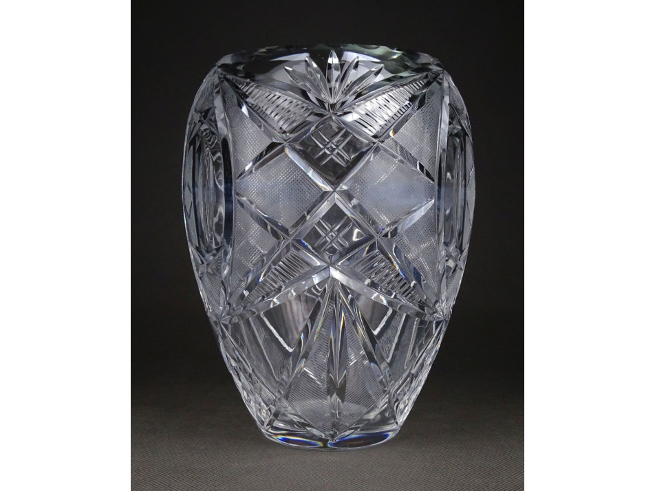 Gyönyörű, csiszolatokkal gazdagon díszített, vastagfalú kristály váza, díszváza. Gyönyörű öblös virágváza.