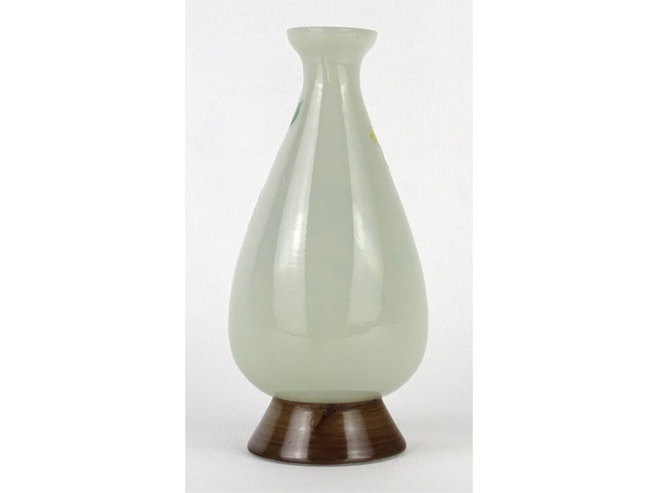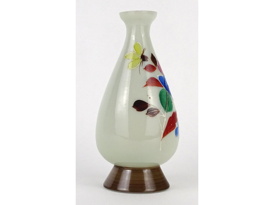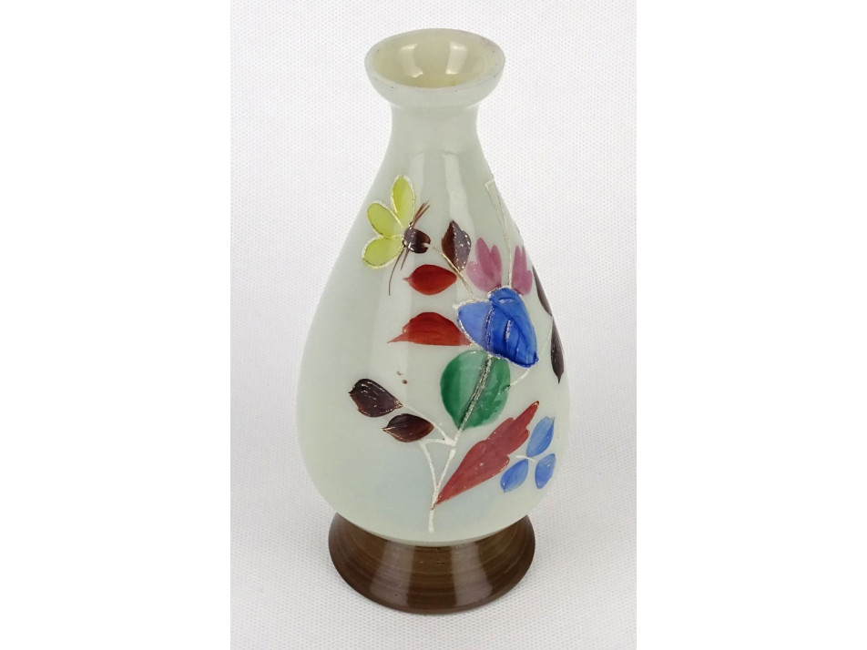 Hibátlan állapotú, színezett fúvott üveg váza, talpas art deco üveg váza, oldalán kézzel festettt motívumokkal díszítve. Talpán a fúvás szakítás nyoma szépen kivehető.