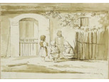 Antik jelzett színezett ceruzarajz - Gyerekek az utcán 16.5 x 11.5 cm