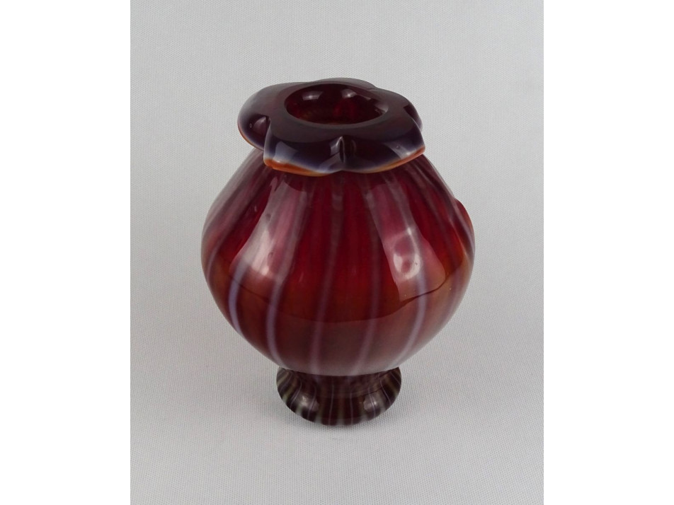 Régi hibátlan állapotú, anyagában színezett bordázott művészi fújt üveg váza. A különböző színű üvegsávok különböző vastagságúak és ez különleges bordázottságot ad ennek a szemet gyönyörködtető dísztárgynak.