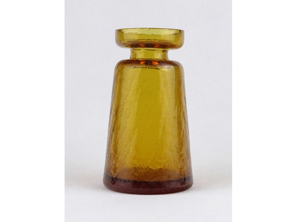 Régi, kis méretű, borostyán sárga színű, vastag falú fújt üveg design váza. Felülete repesztett, erezett mintázatú.
