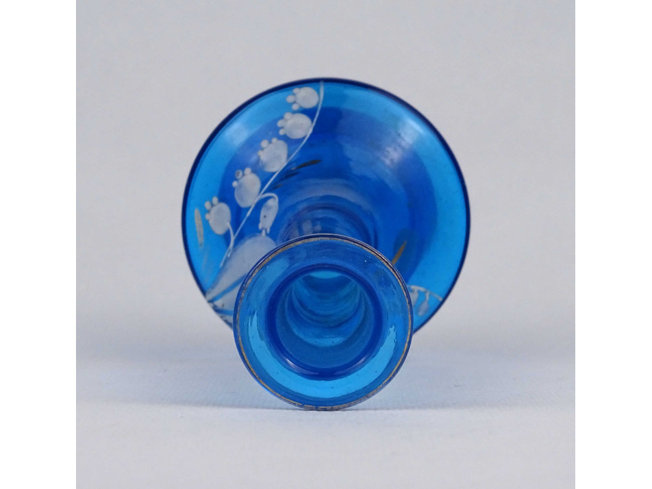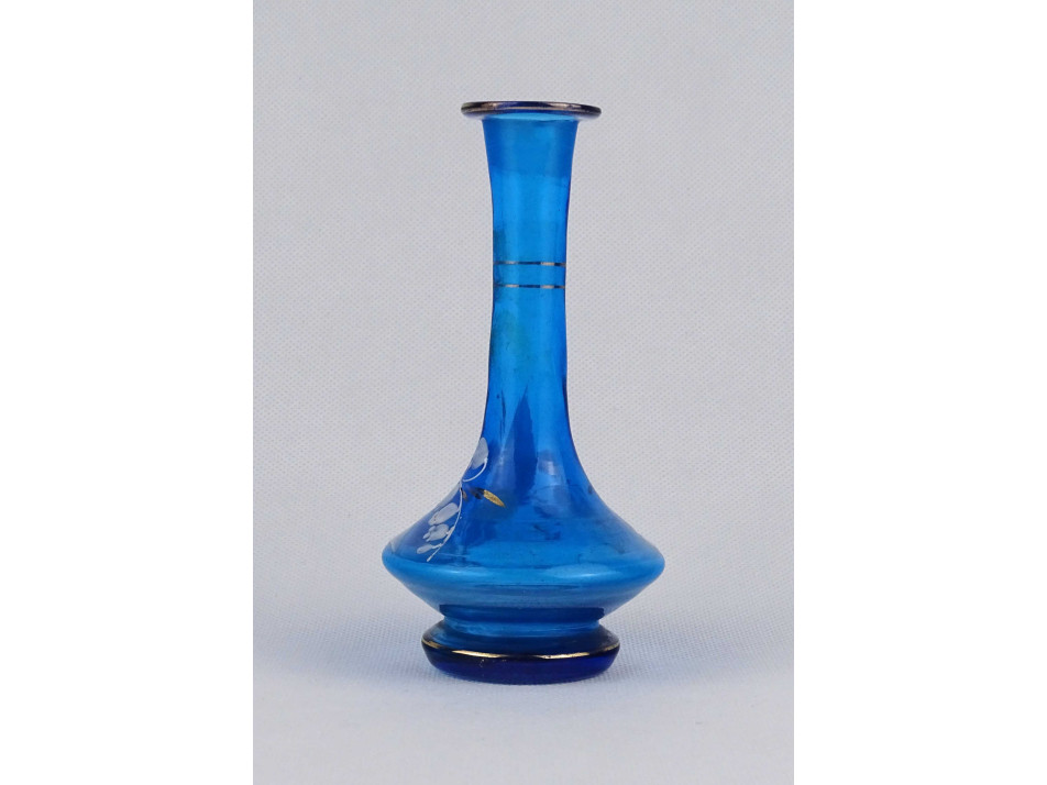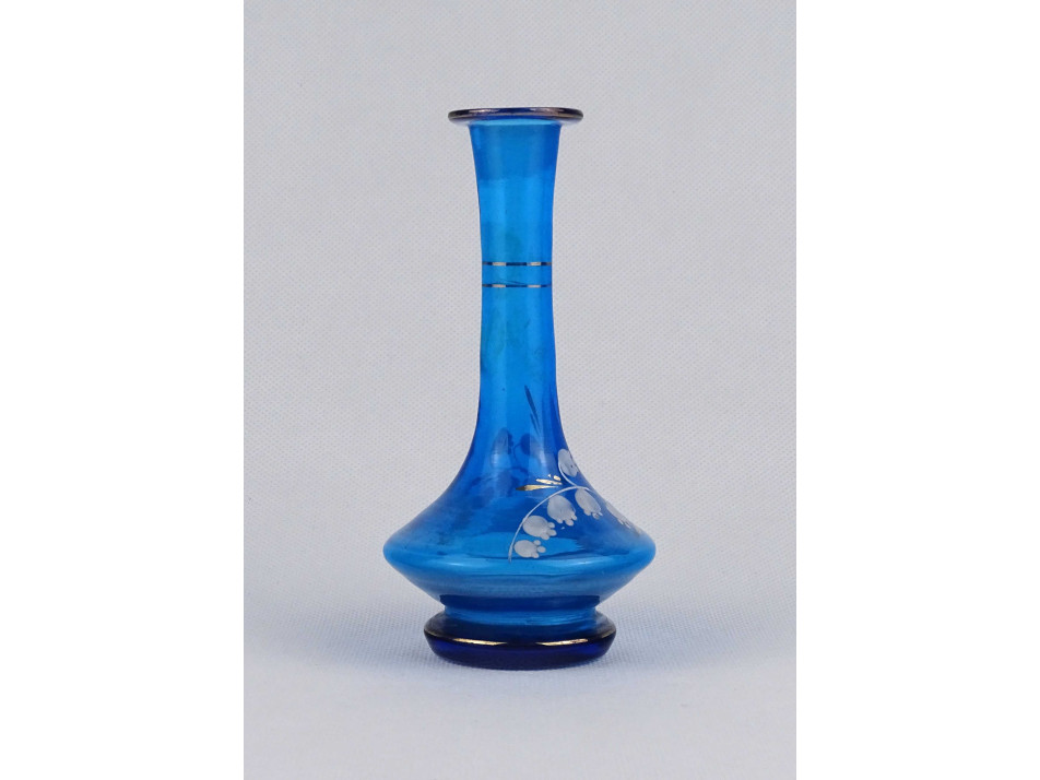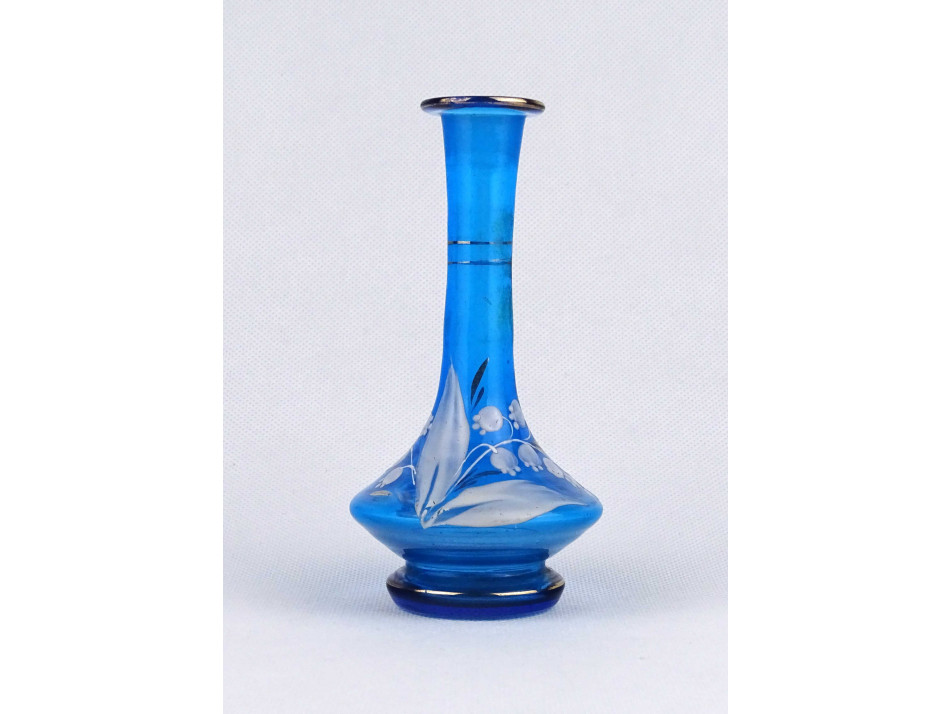 Gyönyörű, antik kis méretű, kék színű, fújt üveg váza, ibolyaváza, díszváza. Oldalán körben gyöngyvirágos festés díszíti.