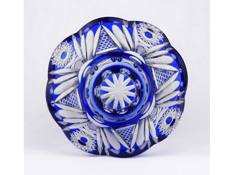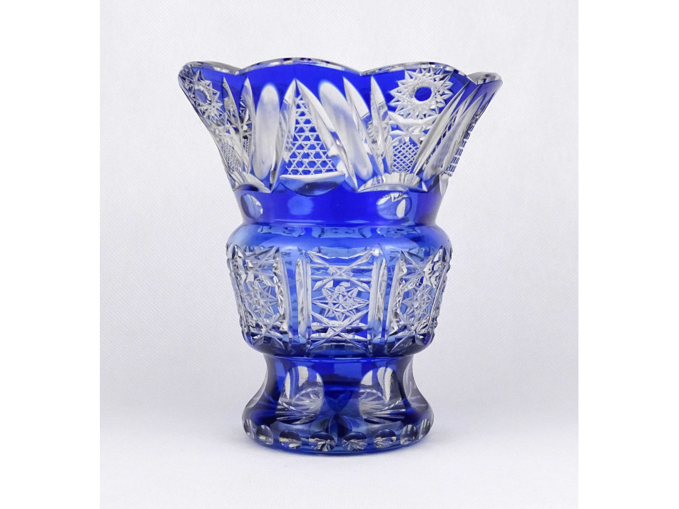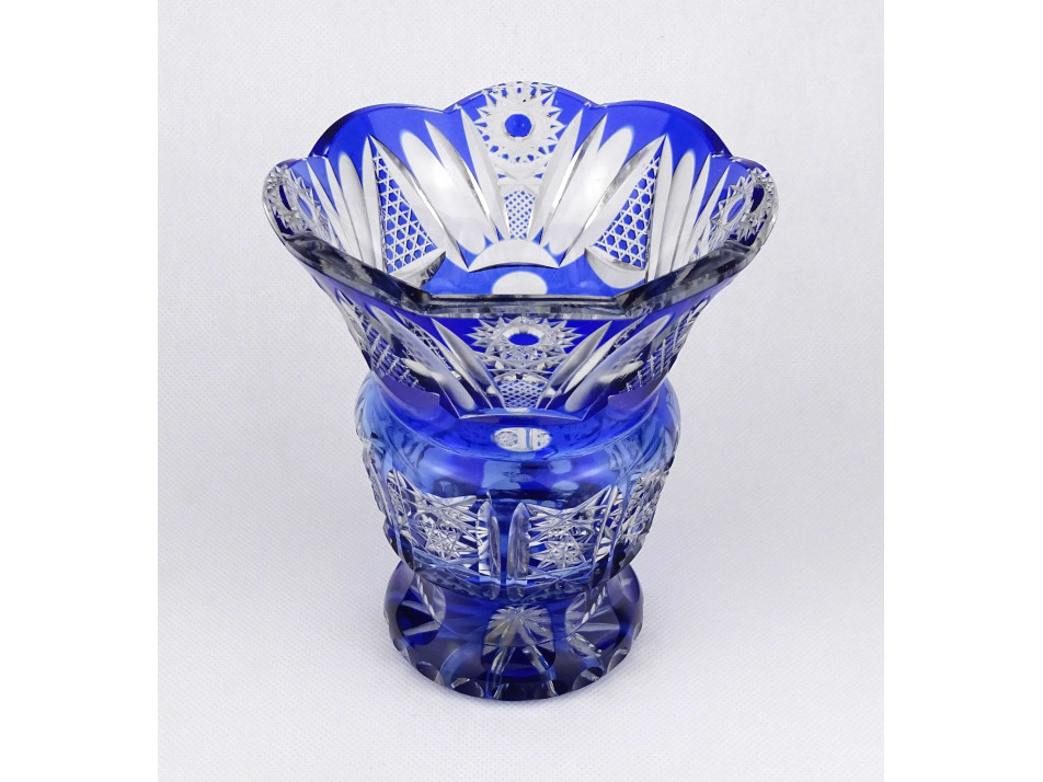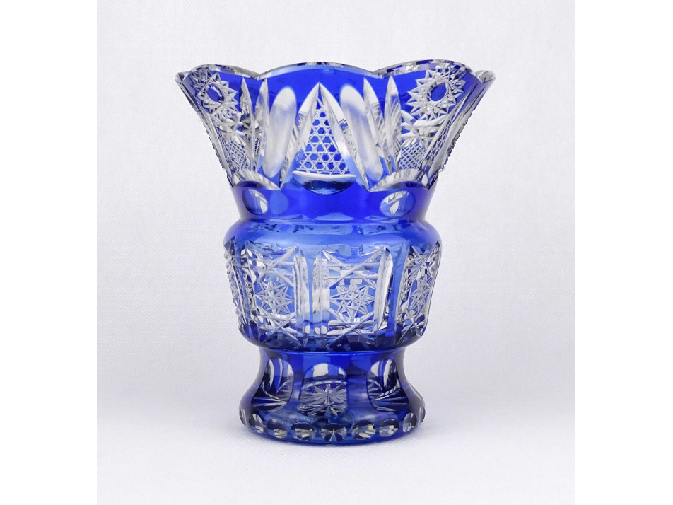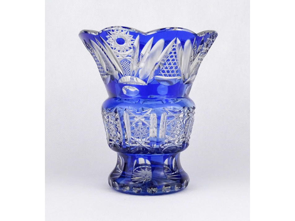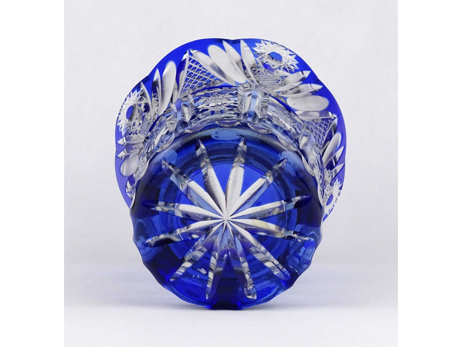 Hibátlan állapotú, talpas, királykékre színezett, csiszolatokkal gazdagon díszített kristály váza.