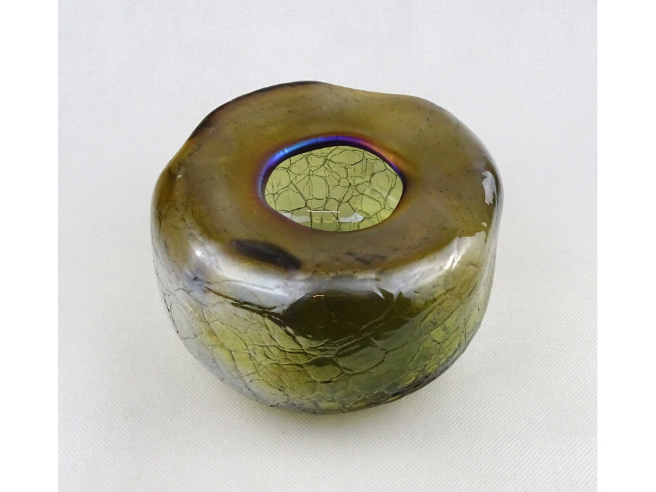 Hibátlan állapotú, gyönyörű, irizáló rétegelt kraklé, crackle, művészi üveg váza, design váza. Alján a fújás, szakítás nyomát csiszolással tüntették el.