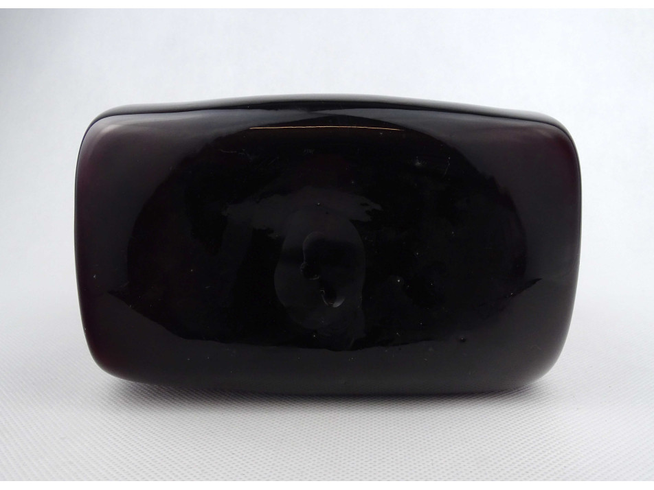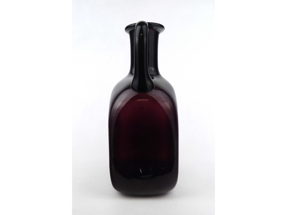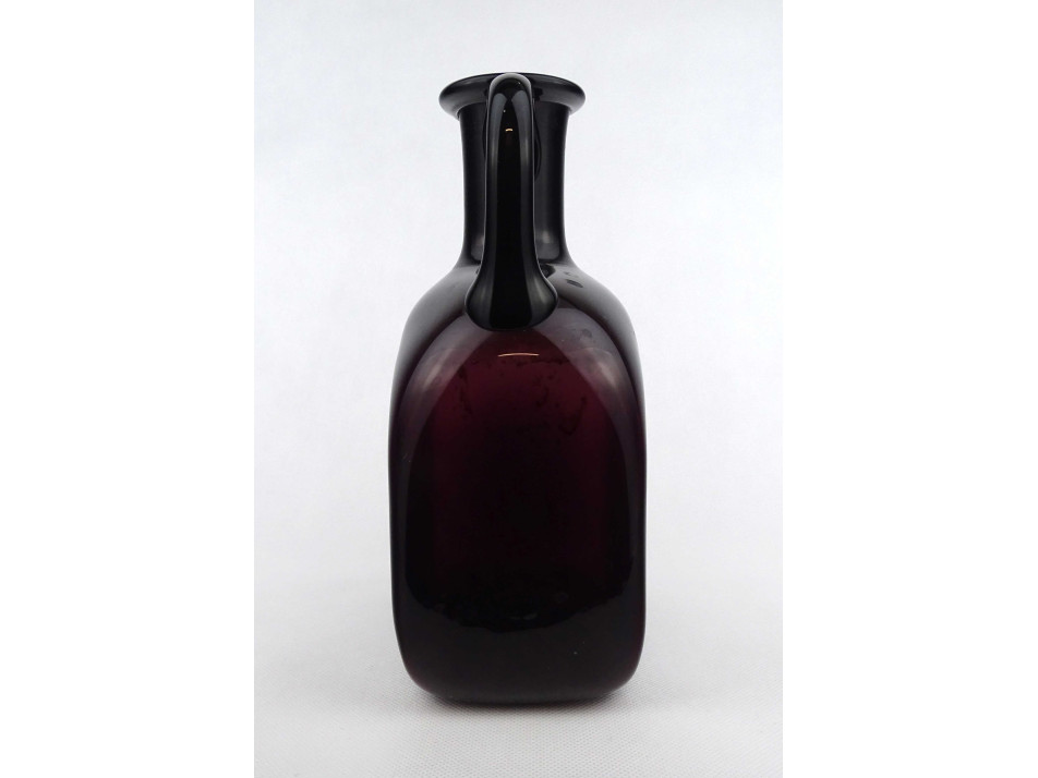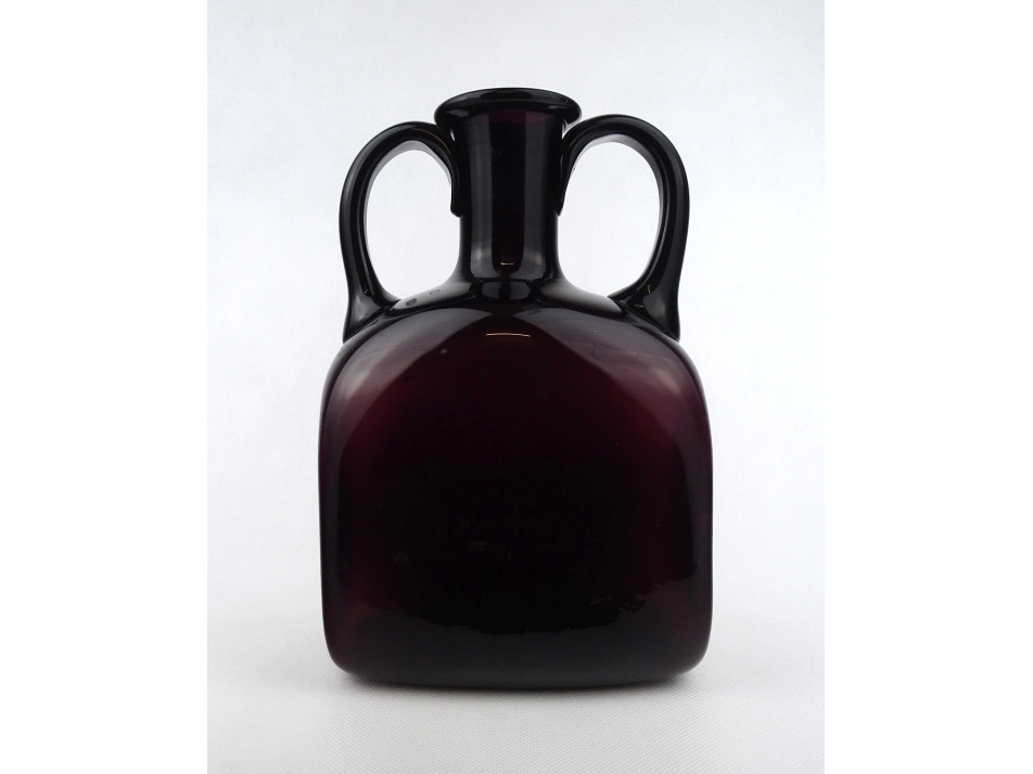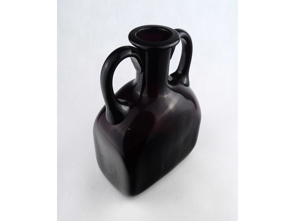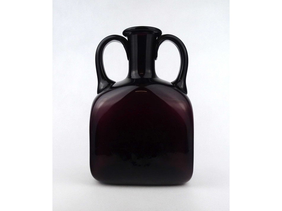 Hibátlan állapotú, vastag falú, mélylila színű művészi fújt üveg palack, kétfülű design váza, a 60-as évekből. Talpán a fújás, szakítás nyomát csiszolással tüntették el.